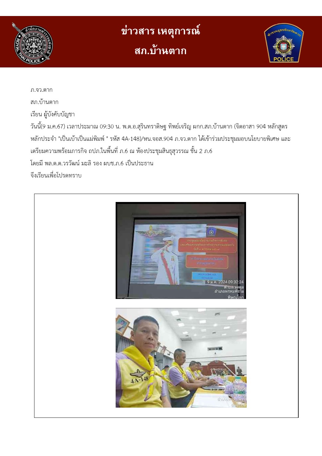 (จิตอาสา 904 หลักสูตรหลักประจำ “เป็นเบ้าเป็นแม่พิมพ์ ” รหัส 4A-148)/หน.จอส.904 ภ.จว.ตาก ได้เข้าร่วมประชุมมอบนโยบายพิเศษ และเตรียมความพร้อมภารกิจ ถปภ.ในพื้นที่ ภ.6Bantakpolice9 มกราคม 2567เหตุการณ์ มกราคม 2567