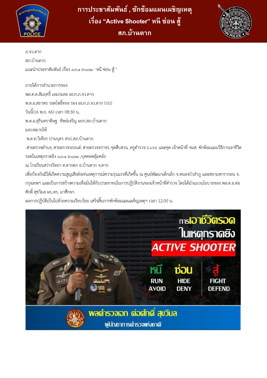 ซักซ้อมแผนวิธีการเอาชีวิตรอดในเหตุกราดยิง Active Shooter /บุคคลคลุ้มคลั่งณ โรงเรียนสว่างวิทยา ต.ตากตก อ.บ้านตาก จ.ตากBantakpolice16 พฤศจิกายน 2566การฝึกทบทวน และ การฝึกยุทธวิธี