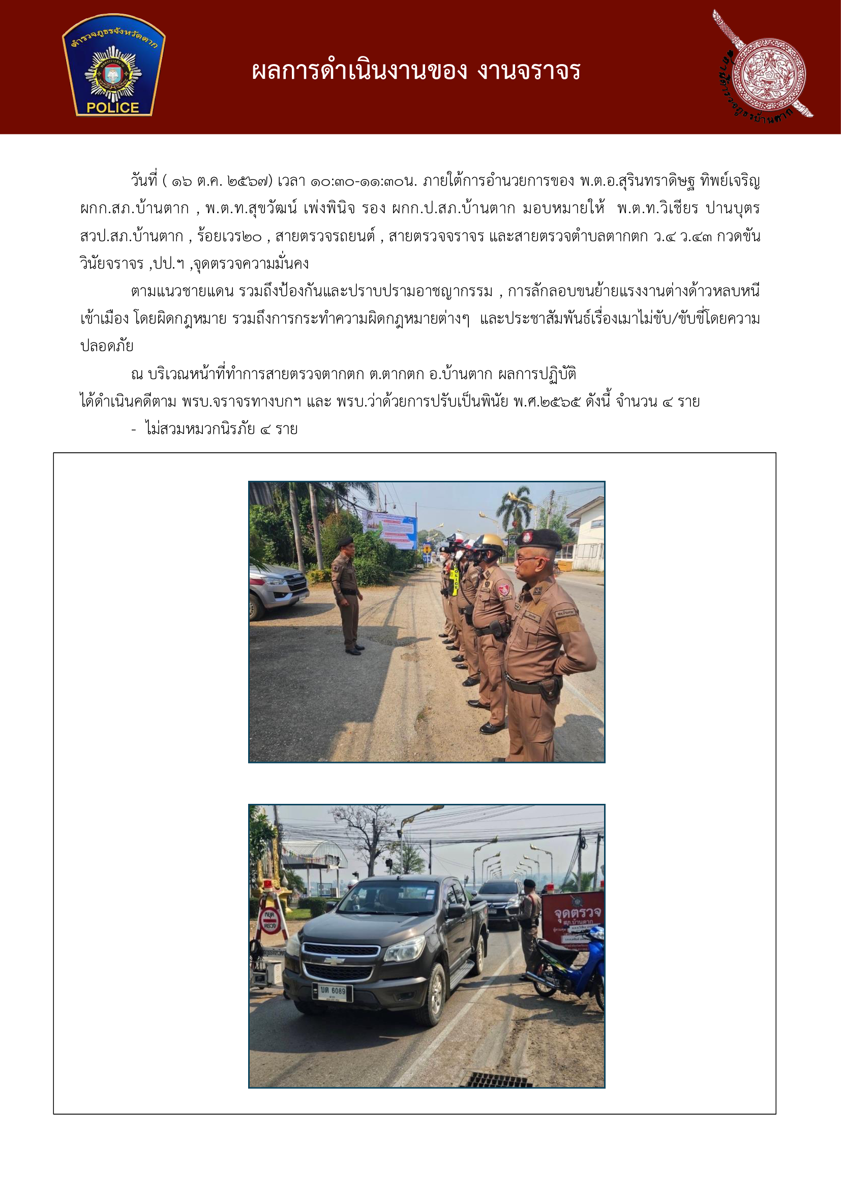 ตามแนวชายแดน รวมถึงป้องกันและปราบปรามอาชญากรรม , การลักลอบขนย้ายแรงงานต่างด้าวหลบหนีเข้าเมือง โดยผิดกฎหมาย รวมถึงการกระท าความผิดกฎหมายต่างๆ และประชาสัมพันธ์เรื่องเมาไม่ขับ/ขับขี่โดยความปลอดภัยณ บริเวณหน้าที่ท าการสายตรวจตากตก ต.ตากตก อ.บ้านตาก ผลการปฏิบัติBantakpolice16 ตุลาคม 2567ตุลาคม 2567, ผลการปฏิบัติงานจราจร ประจำเดือน ต.ค 67