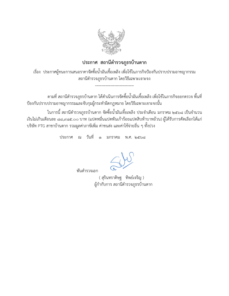 ประกาศผู้ชนะการเสนอราคา จัดซื้อน้ำมันเชื้อเพลิง ประจำเดือน มกราคม 2568