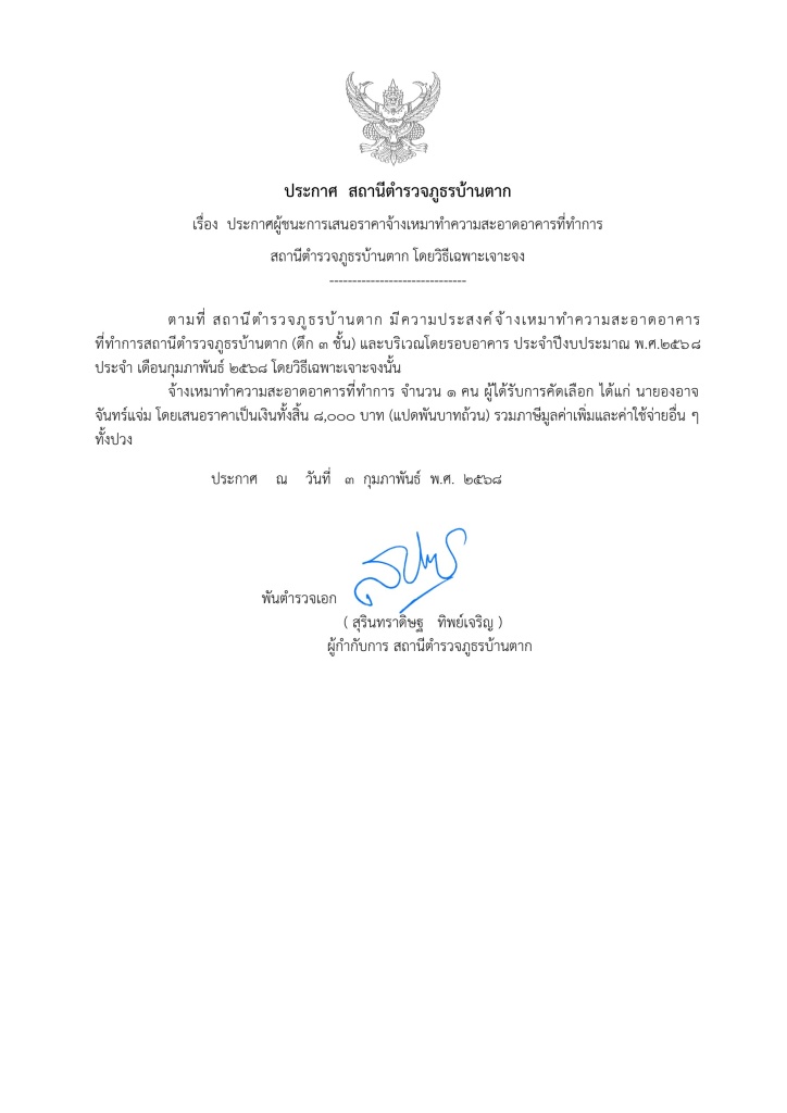 ประกาศผู้ชนะการเสนอราคา จ้างเหมาทำความสะอาด ประจำเดือน กุมภาพันธ์ 2568