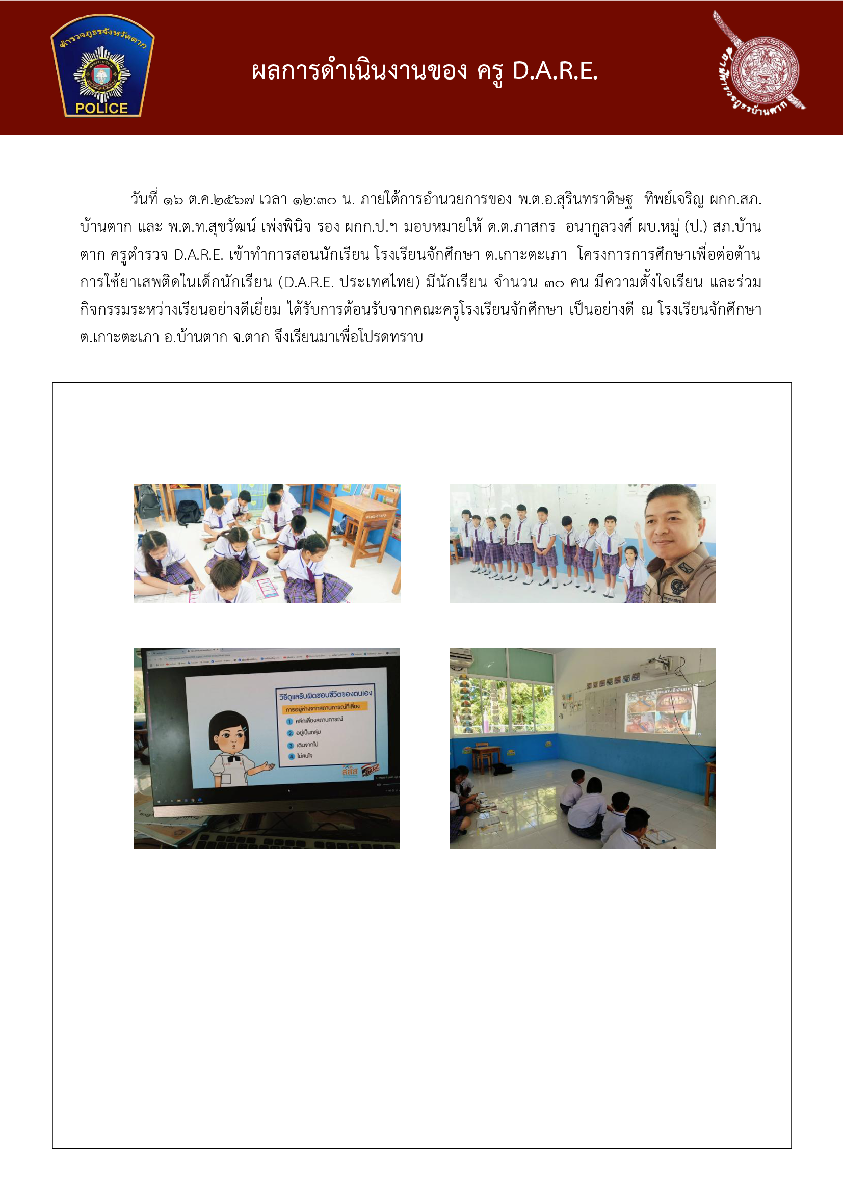 วันที่ 16 ต.ค.2567 เวลา 12:30 น. ภายใต้การอำนวยการของ พ.ต.อ.สุรินทราดิษฐ ทิพย์เจริญ ผกก.สภ.บ้านตาก และ พ.ต.ท.สุขวัฒน์ เพ่งพินิจ รอง ผกก.ป.ฯ มอบหมายให้ ด.ต.ภาสกร อนากูลวงศ์ ผบ.หมู่ (ป.) สภ.บ้านตาก ครูตำรวจ D.A.R.E. เข้าทำการสอนนักเรียน โรงเรียนจักศึกษา ต.เกาะตะเภา โครงการการศึกษาเพื่อต่อต้านการใช้ยาเสพติดในเด็กนักเรียน (D.A.R.E. ประเทศไทย)Bantakpolice16 ตุลาคม 2567ตุลาคม 2567, ผลการดำเนินงานของ ครู D.A.R.E. ต.ค 67