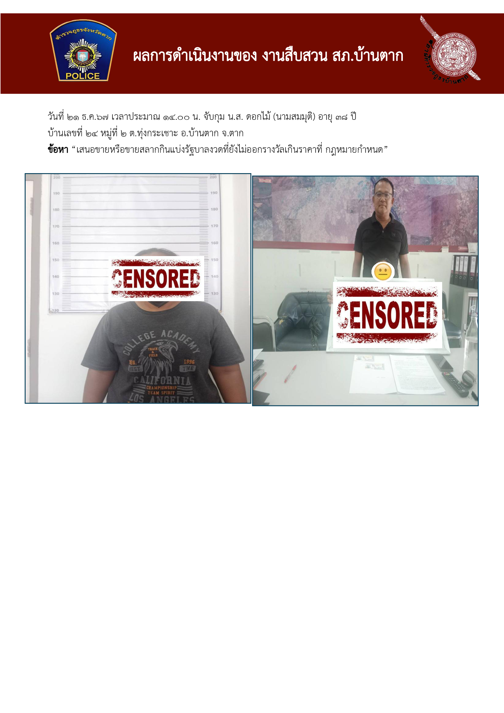 วันที่ 21 ธ.ค.67 เวลาประมาณ 14.00 น. จับกุม น.ส. ดอกไม้ (นามสมมุติ) อายุ 38 ปีบ้านเลขที่ 24 หมู่ที่ 2 ต.ทุ่งกระเชาะ อ.บ้านตาก จ.ตากข้อหา “เสนอขายหรือขายสลากกินแบ่งรัฐบาลงวดที่ยังไม่ออกรางวัลเกินราคาที่ กฎหมายกำหนด”Bantakpolice21 ธันวาคม 2567ธันวามคม 2567, ผลการปฏิบัติงานสืบสวน ประจำเดือน ธ.ค 67