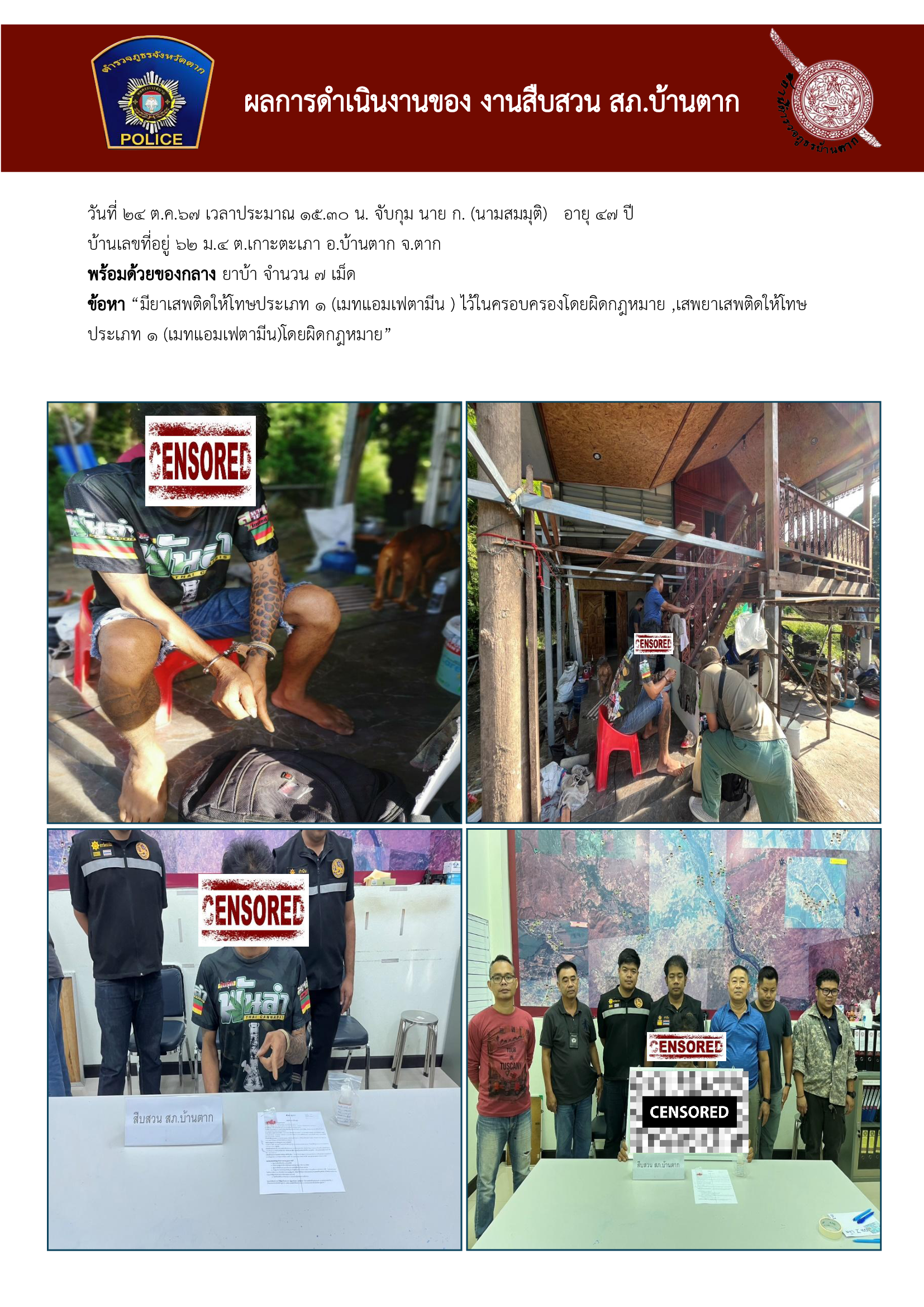 วันที่ 24 ต.ค.67 เวลาประมาณ 15.30 น. จับกุม นาย ก. (นามสมมุติ) อายุ 47 ปีบ้านเลขที่อยู่ 62 ม.4 ต.เกาะตะเภา อ.บ้านตาก จ.ตากพร้อมด้วยของกลาง ยาบ้า จำนวน 7 เม็ดข้อหา “มียาเสพติดให้โทษประเภท 1 (เมทแอมเฟตามีน ) ไว้ในครอบครองโดยผิดกฎหมาย ,เสพยาเสพติดให้โทษประเภท 1 (เมทแอมเฟตามีน)โดยผิดกฎหมาย”