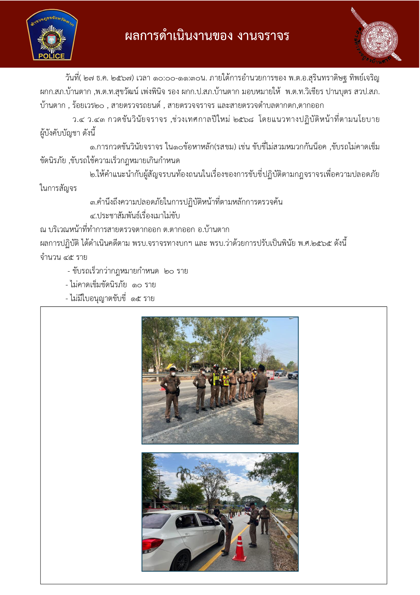 วันที่( 27 ธ.ค. 2567) เวลา 10:00-11:30น. ภายใต้การอำนวยการของ พ.ต.อ.สุรินทราดิษฐ ทิพย์เจริญผกก.สภ.บ้านตาก ,พ.ต.ท.สุขวัฒน์ เพ่งพินิจ รอง ผกก.ป.สภ.บ้านตาก มอบหมายให้ พ.ต.ท.วิเชียร ปานบุตร สวป.สภ.บ้านตาก , ร้อยเวร20 , สายตรวจรถยนต์ , สายตรวจจราจร และสายตรวจตำบลตากตก,ตากออกว.4 ว.43 กวดขันวินัยจราจร ,ช่วงเทศกาลปีใหม่ 2568 โดยแนวทางปฏิบัติหน้าที่ตามนโยบายผู้บังคับบัญชา