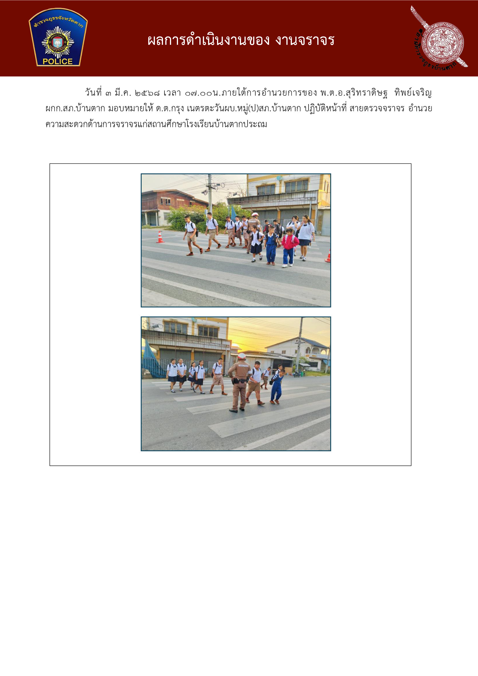 วันที่ 3 มี.ค. 2568 เวลา 07.00น.ภายใต้การอำนวยการของ พ.ต.อ.สุริทราดิษฐ ทิพย์เจริญผกก.สภ.บ้านตาก มอบหมายให้ ด.ต.กรุง เนตรตะวันผบ.หมู่(ป)สภ.บ้านตาก ปฏิบัติหน้าที่ สายตรวจจราจร อำนวยความสะดวกด้านการจราจรแก่สถานศึกษาโรงเรียนบ้านตากประถมBantakpolice3 มีนาคม 2568ผลการปฏิบัติงานจราจร ประจำเดือน มี.ค 68, มีนาคม 2568