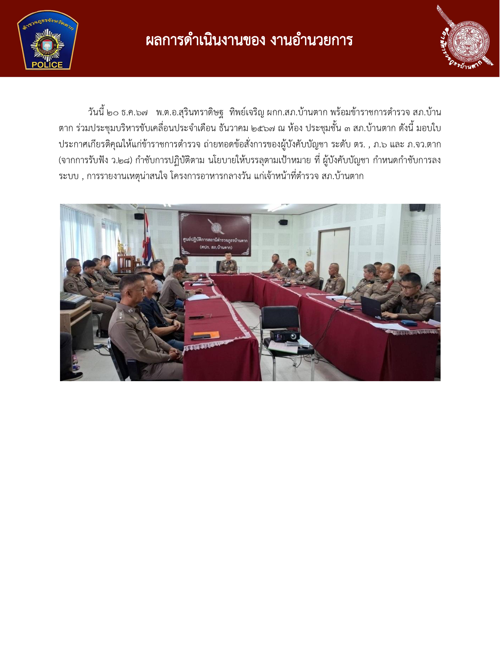 วันนี้ 20 ธ.ค.67 พ.ต.อ.สุรินทราดิษฐ ทิพย์เจริญ ผกก.สภ.บ้านตาก พร้อมข้าราชการตำรวจ สภ.บ้านตาก ร่วมประชุมบริหารขับเคลื่อนประจำเดือน ธันวาคม 2567 ณ ห้อง ประชุมชั ้น 3 สภ.บ้านตาก ดังนี้ มอบใบประกาศเกียรติคุณให้แก่ข้าราชการตำรวจ ถ่ายทอดข้อสั ่งการของผู้บังคับบัญชา ระดับ ตร. , ภ.6 และ ภ.จว.ตาก(จากการรับฟัง ว.28) กำชับการปฏิบัติตาม นโยบายให้บรรลุตามเป้าหมาย ที่ ผู้บังคับบัญชา กำหนดกำชับการลงระบบ , การรายงานเหตุน่าสนใจ โครงการอาหารกลางวัน แก่เจ้าหน้าที่ตำรวจ สภ.บ้านตากBantakpolice20 ธันวาคม 2567ธันวามคม 2567, ผลการปฏิบัติงานอำนวยการ ประจำเดือน ธ.ค 67