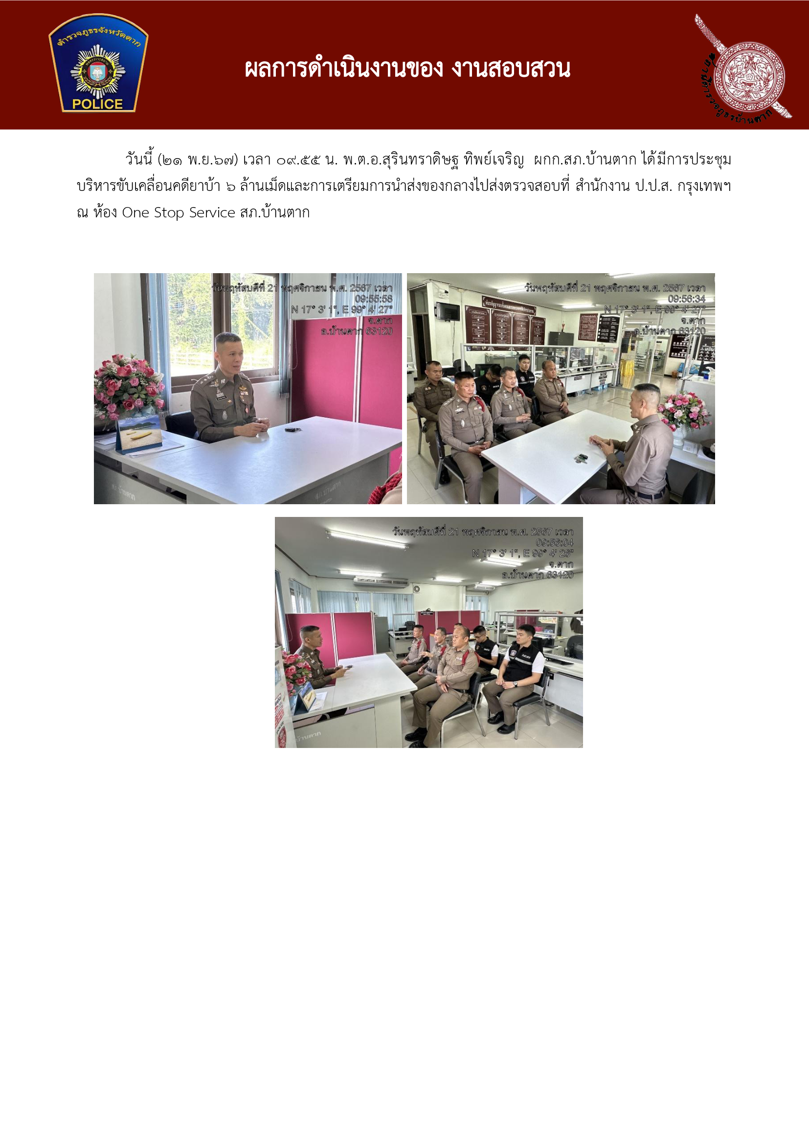 วันนี้ (21 พ.ย.67) เวลา 09.55 น. พ.ต.อ.สุรินทราดิษฐ ทิพย์เจริญ ผกก.สภ.บ้านตาก ได้มีการประชุมบริหารขับเคลื่อนคดียาบ้า 6 ล้านเม็ดและการเตรียมการนำส่งของกลางไปส่งตรวจสอบที่ สำนักงาน ป.ป.ส. กรุงเทพฯณ ห้อง One Stop Service สภ.บ้านตาก