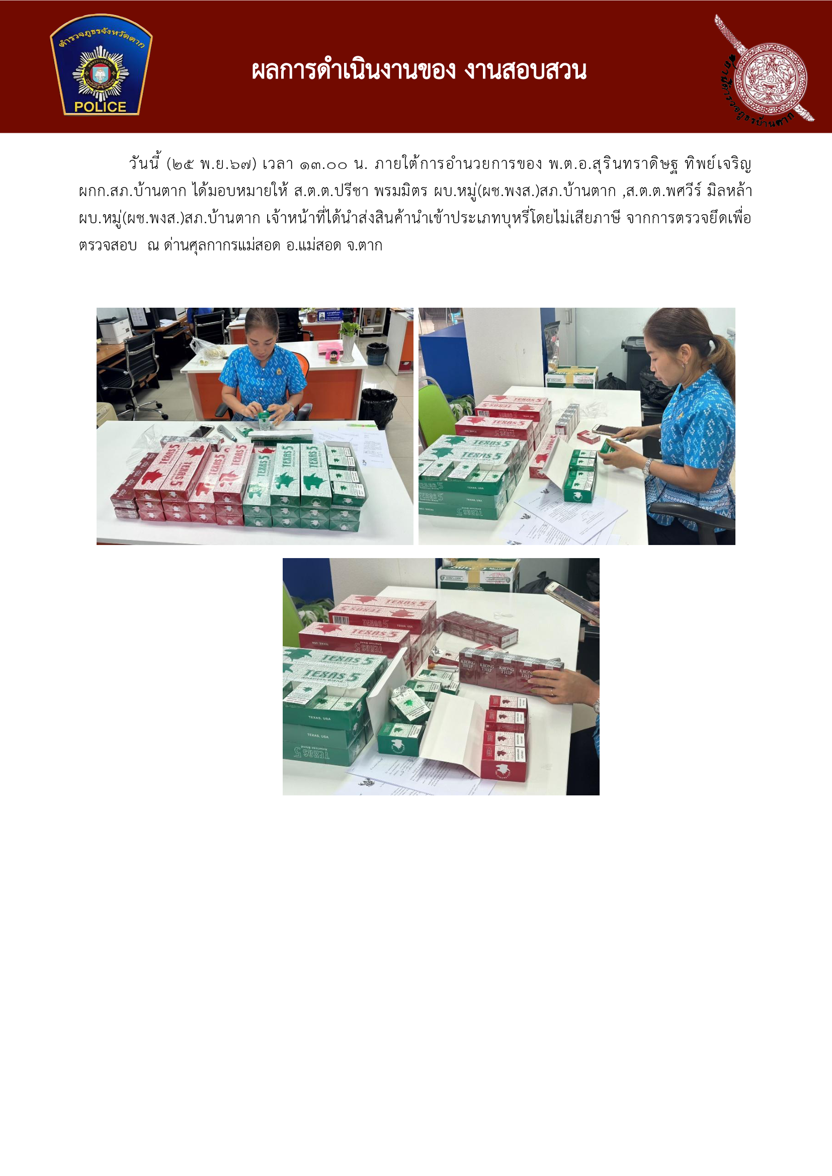วันนี้ (25 พ.ย.67) เวลา 13.00 น. ภายใต้การอำนวยการของ พ.ต.อ.สุรินทราดิษฐ ทิพย์เจริญผกก.สภ.บ้านตาก ได้มอบหมายให้ ส.ต.ต.ปรีชา พรมมิตร ผบ.หมู ่(ผช.พงส.)สภ.บ้านตาก ,ส.ต.ต.พศวีร์ มิลหล้าผบ.หมู ่(ผช.พงส.)สภ.บ้านตาก เจ้าหน้าที่ได้นำส่งสินค้านำเข้าประเภทบุหรี ่โดยไม่เสียภาษี จากการตรวจยึดเพื่อตรวจสอบ ณ ด่านศุลกากรแม่สอด อ.แม่สอด จ.ตาก