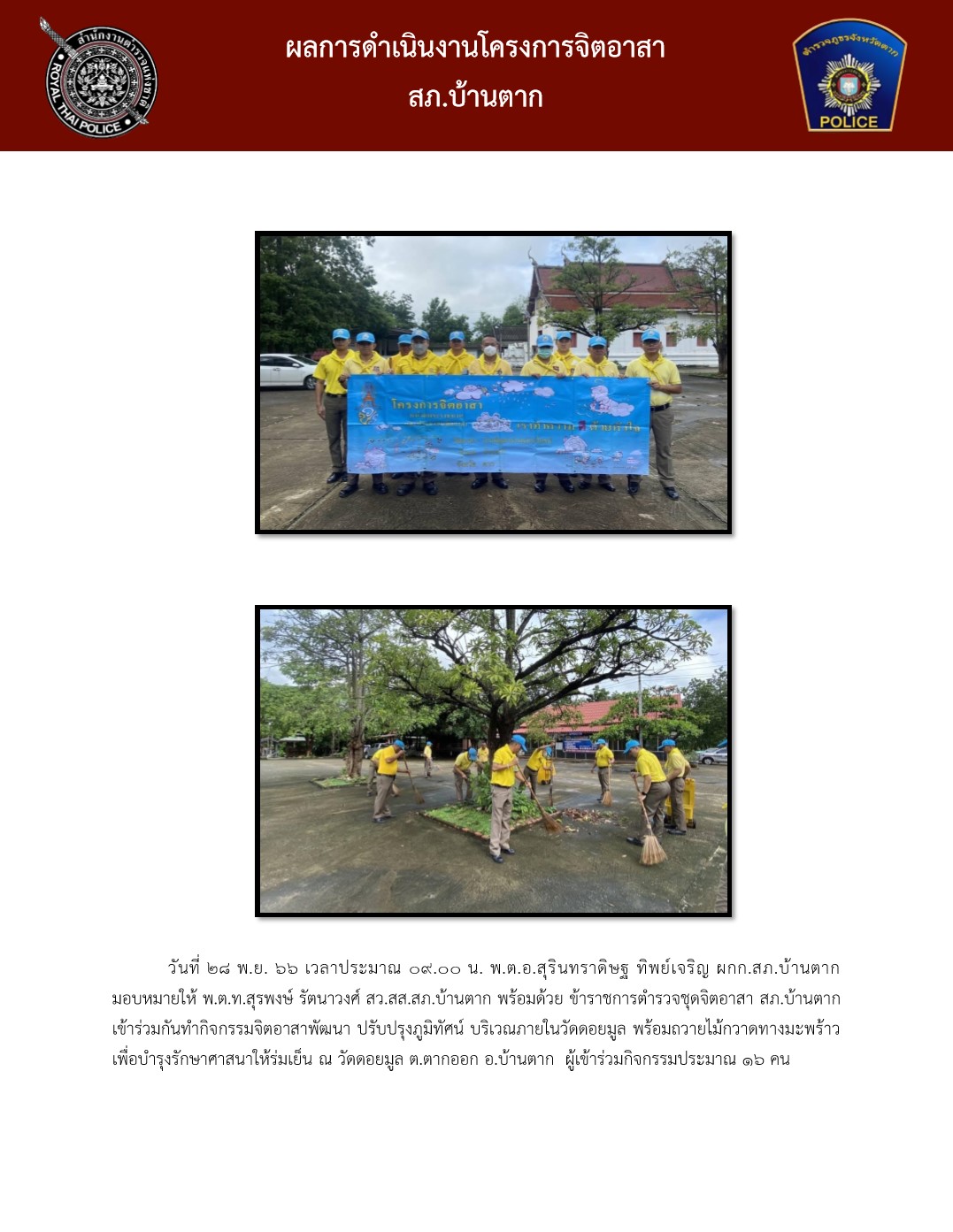 เข้าร่วมกันทำกิจกรรมจิตอาสาพัฒนา ปรับปรุงภูมิทัศน์ บริเวณภายในวัดดอยมูล พร้อมถวายไม้กวาดทางมะพร้าวเพื่อบำรุงรักษาศาสนาให้ร่มเย็นBantakpolice28 พฤศจิกายน 2566โครงการจิตอาสาเราทำความดีด้วยหัวใจ
