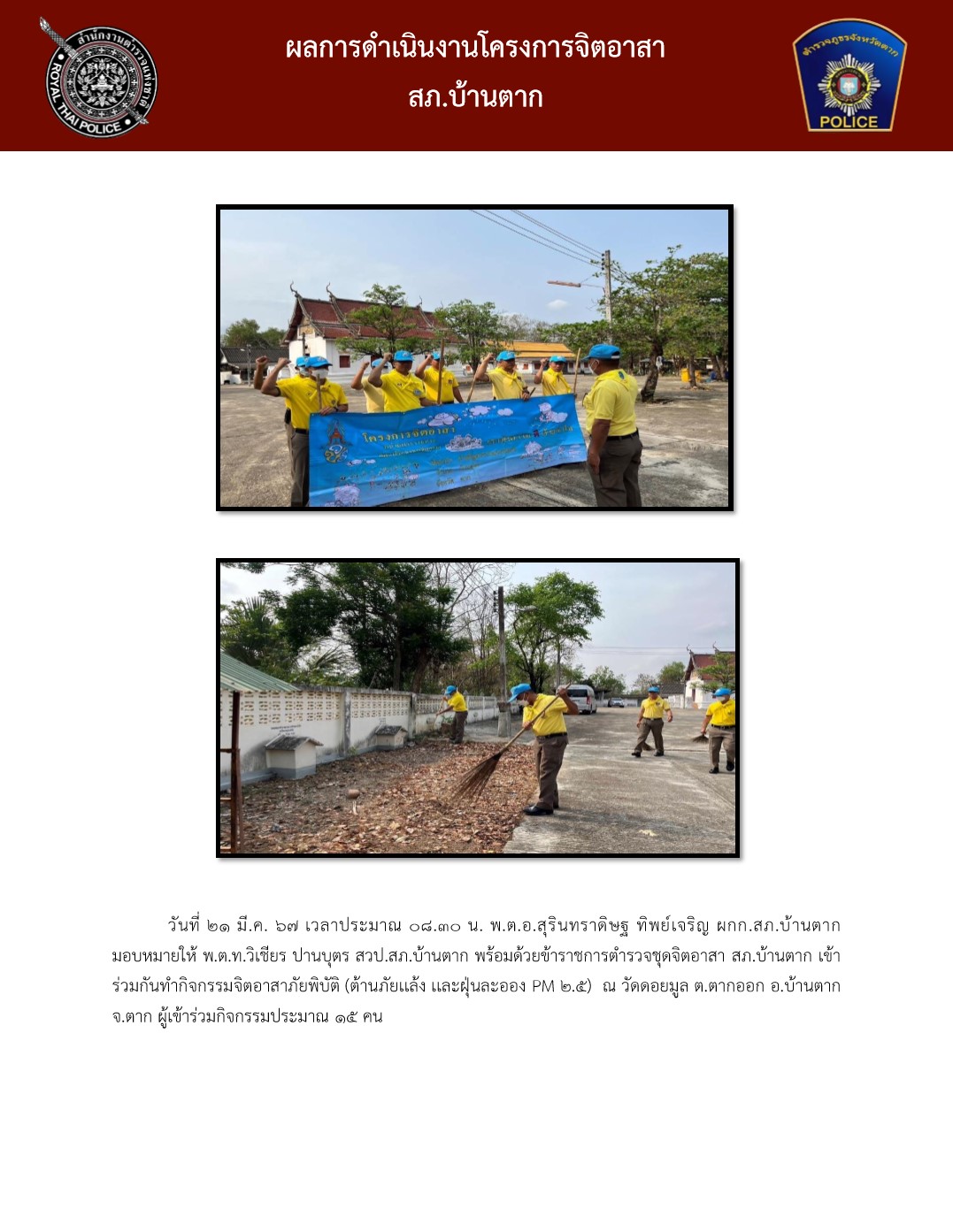 เข้าร่วมกันทำกิจกรรมจิตอาสาภัยพิบัติ (ต้านภัยเเล้ง เเละฝุ ่นละออง PM 2.5) ณ วัดดอยมูล ต.ตากออก อ.บ้านตากจ.ตาก ผู้เข้าร่วมกิจกรรมประมาณ 15 คนBantakpolice21 มีนาคม 2567โครงการจิตอาสาเราทำความดีด้วยหัวใจ