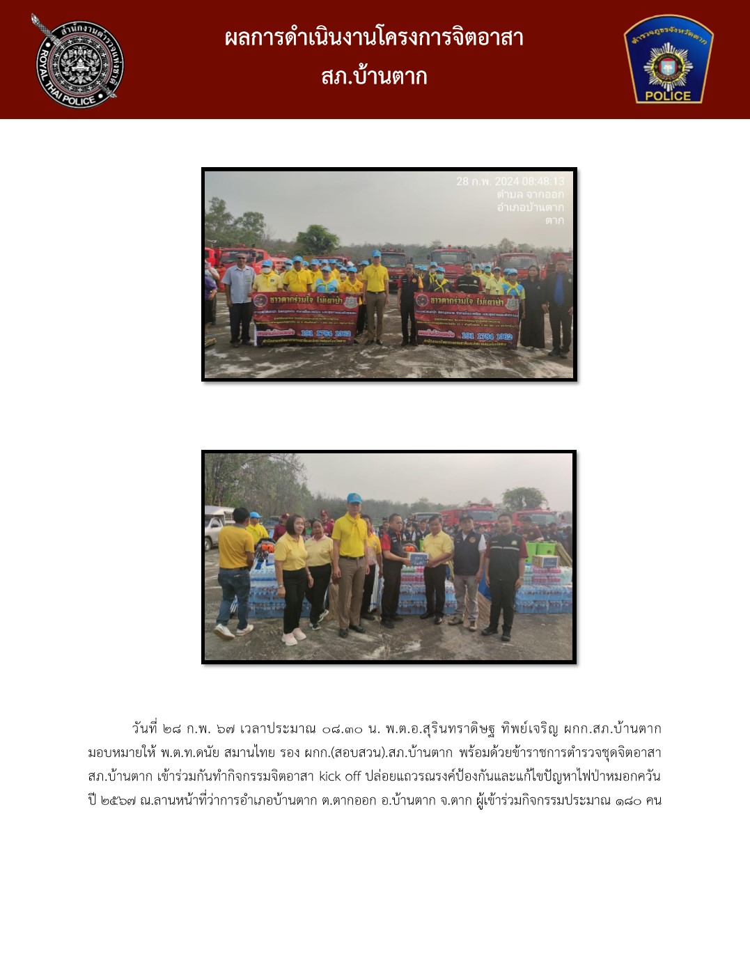 เข้าร่วมกันทำกิจกรรมจิตอาสา kick off ปล่อยแถวรณรงค์ป้องกันและแก้ไขปัญหาไฟป่าหมอกควันปี 2567Bantakpolice28 กุมภาพันธ์ 2567โครงการจิตอาสาเราทำความดีด้วยหัวใจ
