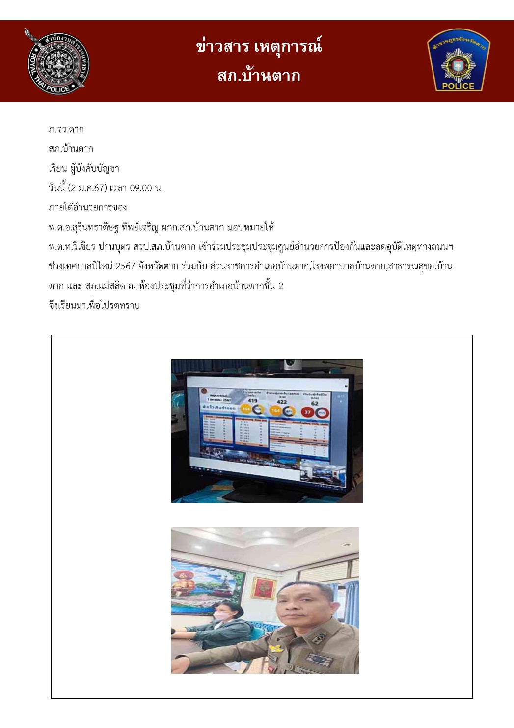 เข้าร่วมประชุมประชุมศูนย์อำนวยการป้องกันและลดอุบัติเหตุทางถนนฯช่วงเทศกาลปีใหม่ 2567 จังหวัดตาก ร่วมกับ ส่วนราชการอำเภอบ้านตาก,โรงพยาบาลบ้านตาก,สาธารณสุขอ.บ้านตาก และ สภ.แม่สลิดBantakpolice2 มกราคม 2567เหตุการณ์ มกราคม 2567
