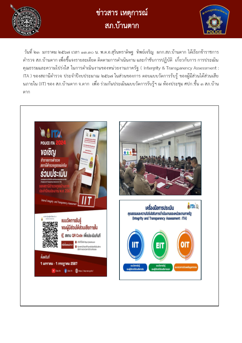 วันที่ 23 มกราคม 2567 เวลา 13.30 น. พ.ต.อ.สุรินทราดิษฐ ทิพย์เจริญ ผกก.สภ.บ้านตาก ได้เรียกข้าราชการตำรวจ สภ.บ้านตาก เพื่อประชุมชี้แจง รายละเอียดติดตามการดำเนินงานและกำชับการปฏิบัติ เกี่ยวกับการ ประเมินคุณธรรมและความโปร่งใส ในการดำเนินงานของหน่วยงานภาครัฐ ( Intergrity & Transparency Assessment : ITA ) ของสถานีตำรวจ ประจำปีงบประมาณ 2567 ในส่วนของการ ตอบแบบวัดการรับรู้ ของผู้มีส่วนได้ส่วนเสียภายใน (IIT) ของ สภ.บ้านตาก จ.ตาก เพื่อ ร่วมกันประเมินแบบวัดการรับรู้ฯ ณ สภ.บ้านตาก ห้องประชุม ศปก.ชั้น 3Bantakpolice23 มกราคม 2567Integrity & Transparency Assessment : ITA, เหตุการณ์ มกราคม 2567