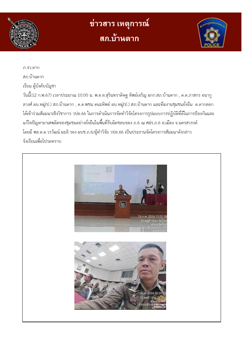 ได้เข้าร่วมสัมมนาเชิงวิชาการ วปอ.66 ในการดำเนินการจัดทำวิจัยโครงการรูปแบบการปฏิบัติที่ดีในการป้องกันและแก้ไขปัญหายาเสพติดของชุมชนอย่างยั่งยืนในพื้นที่รับผิดชอบของ ภ.6 ณ ศฝร.ภ.6Bantakpolice12 กุมภาพันธ์ 2567เหตุการณ์ กุมภาพันธ์ 2567