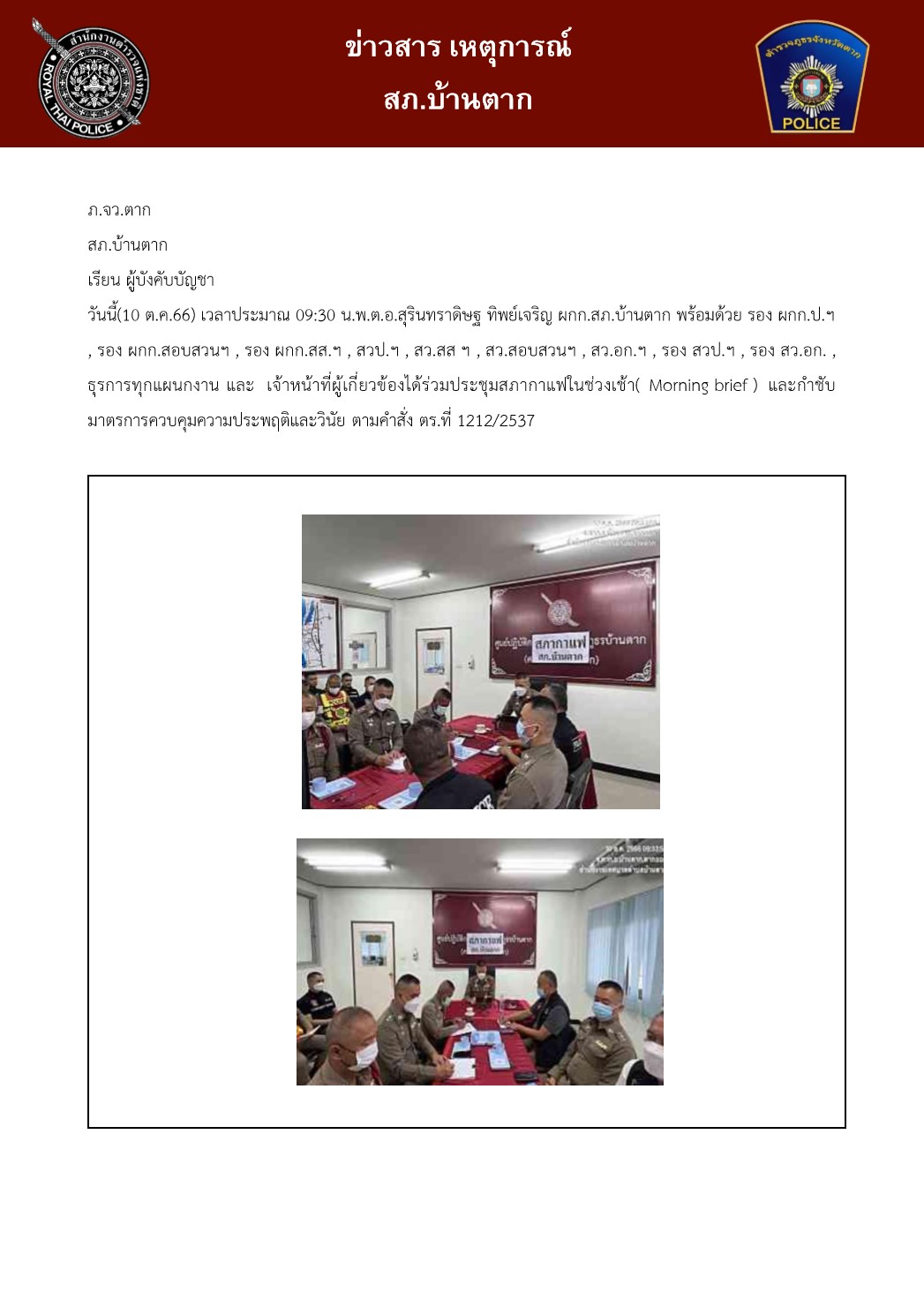 ได้ร่วมประชุมสภากาแฟในช่วงเช้า( Morning brief ) และกำชับมาตรการควบคุมความประพฤติและวินัยBantakpolice10 ตุลาคม 2023เหตุการณ์ ตุลาคม 2566
