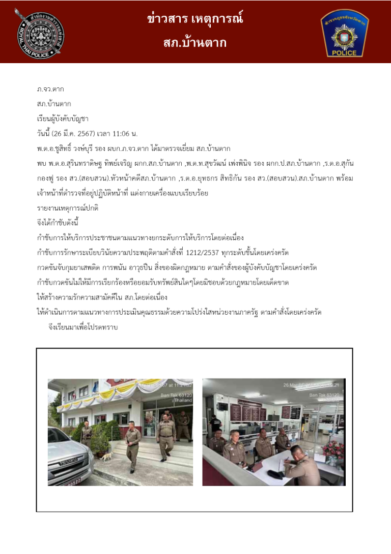 วันที่ 1 ต.ค. 67 สายตรวจรถยนต์ได้ออกตรวจเปิดสัญญาณไฟ จุดเสี่ยงหลัก-จุดรอง ตามโครงการPolice 4.0 ป้องกันอาชญากรรมและความปลอดภัย ในชีวิต ทรัพย์สิน ในพื้นที่อ.บ้านตาก