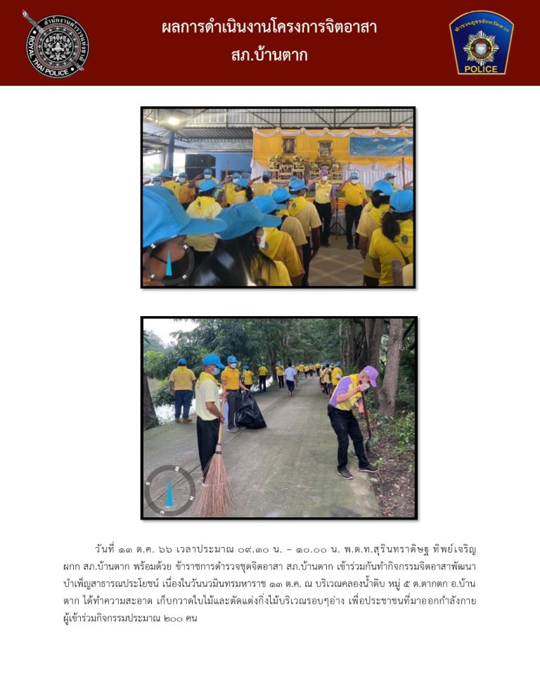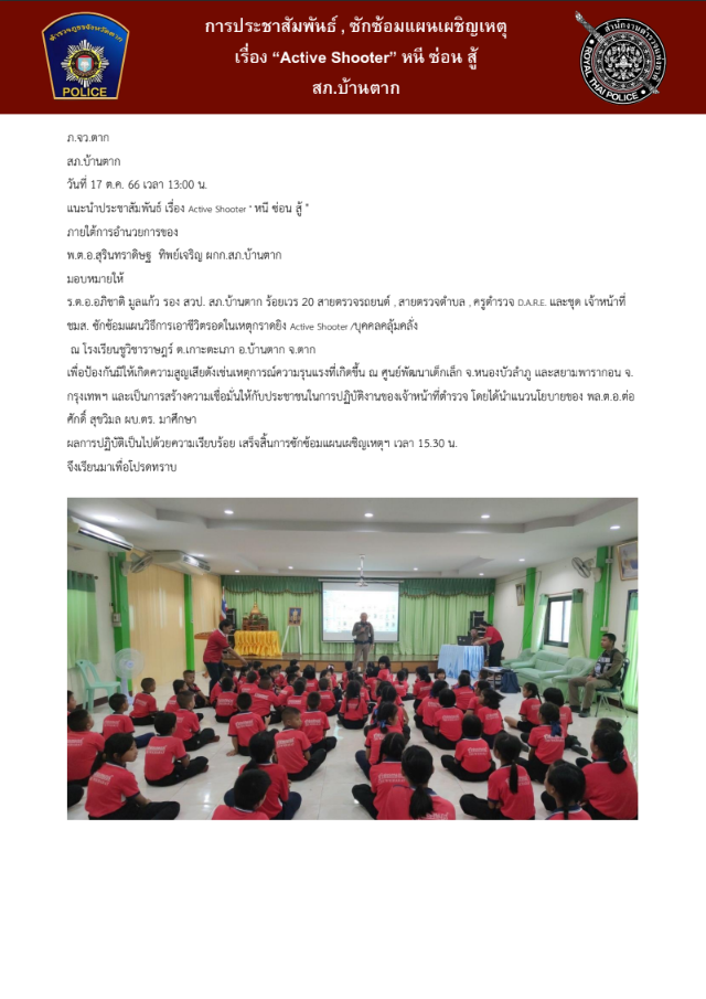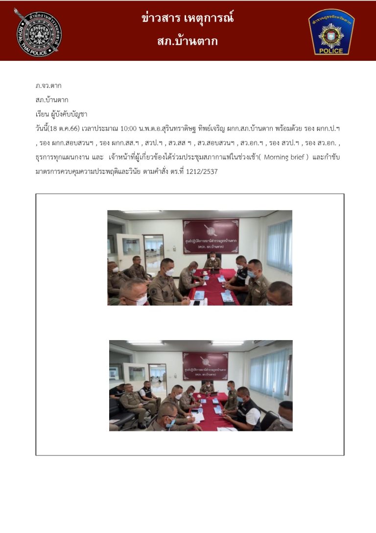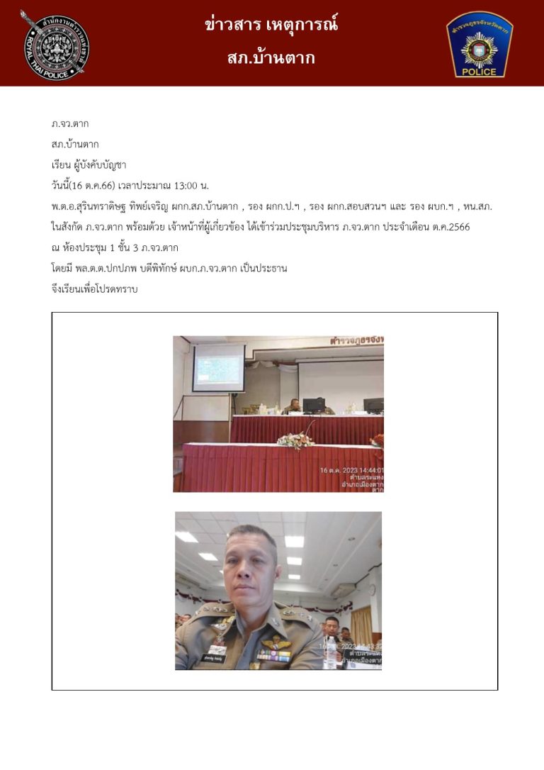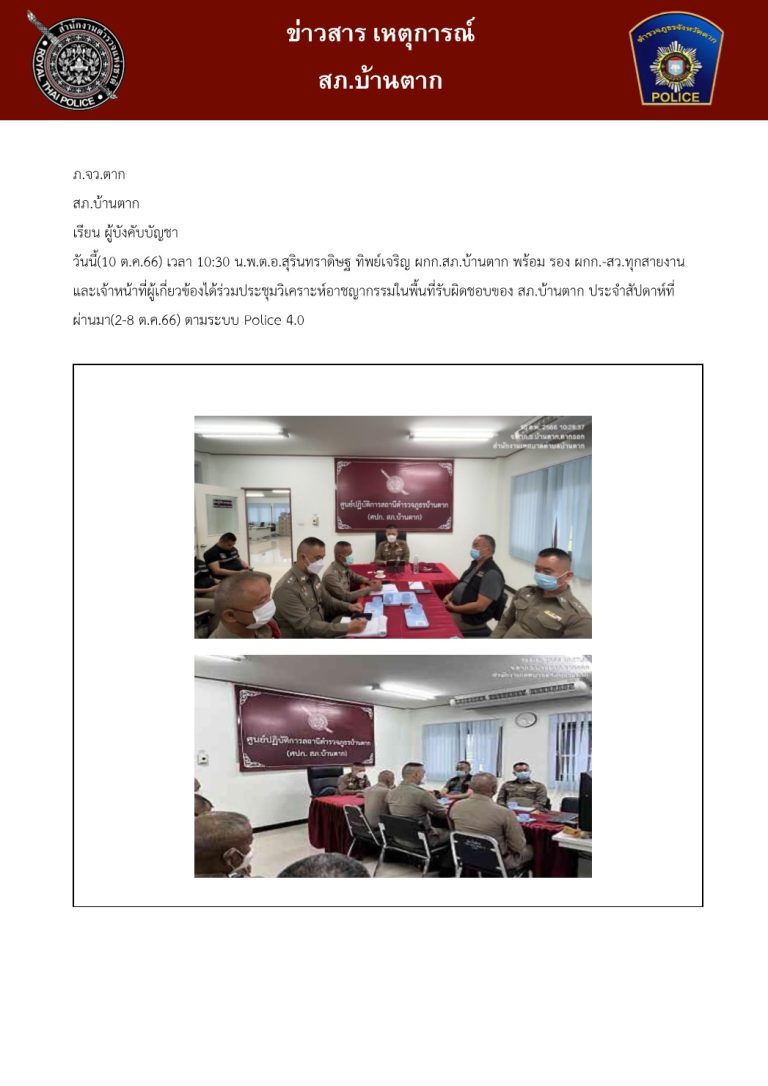 ได้เรียกข้าราชการตำรวจ สภ.บ้านตาก ประชุมแถว ชี้แจงการปฏิบัติ ตรวจจำนวนและตรวจจสอบความพร้อมต่างๆเพื่อเข้าประจำจุดปฏิบัติภารกิจอำนวยความสะดวกการจราจรและรักษาความปลอดภัยแก่ขบวนรถยนต์