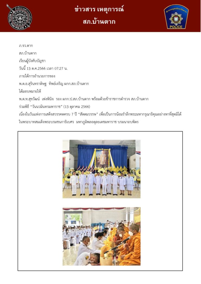 ร่วมพิธี “วันนวมินทรมหาราช” (13 ตุลาคม 2566)เนื่องในวันแห่งการเสด็จสวรรคตครบ 7 ปี “สัตตมวรรษ” เพื่อเป็นการน้อมรำลึกพระมหากรุณาธิคุณอย่างหาที่สุดมิได้ร่วมพิธี “วันนวมินทรมหาราช” (13 ตุลาคม 2566)