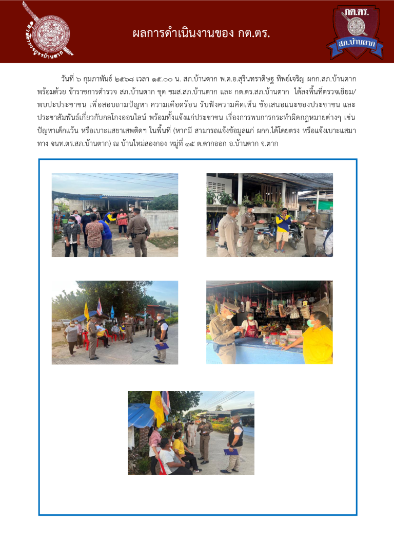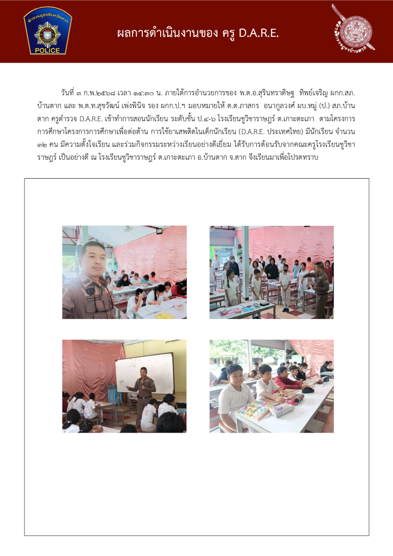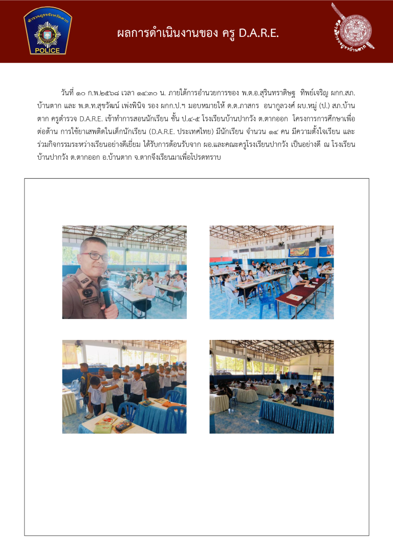 วันที่ 10 ก.พ.2568 เวลา 14:30 น. ภายใต้การอำนวยการของ พ.ต.อ.สุรินทราดิษฐ ทิพย์เจริญ ผกก.สภ.บ้านตาก และ พ.ต.ท.สุขวัฒน์ เพ่งพินิจ รอง ผกก.ป.ฯ มอบหมายให้ ด.ต.ภาสกร อนากูลวงศ์ ผบ.หมู ่ (ป.) สภ.บ้านตาก ครูตำรวจ D.A.R.E. เข้าทำการสอนนักเรียน ชั้น ป.4-5 โรงเรียนบ้านปากวัง ต.ตากออก โครงการการศึกษาเพื่อต่อต้าน การใช้ยาเสพติดในเด็กนักเรียน (D.A.R.E. ประเทศไทย)