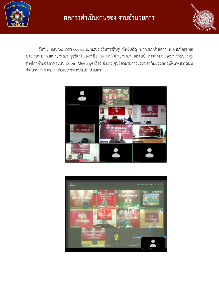 วันที่ 3 ม.ค. 68 เวลา 09:30 น. พ.ต.อ.สุรินทราดิษฐ ทิพย์เจริญ ผกก.สภ.บ้านตาก, พ.ต.ท.พิษณุ พลบุตร รอง ผกก.สส.ฯ, พ.ต.ท.สุขวัฒน์ เพ่งพินิจ รอง ผกก.ป.ฯ, พ.ต.ท.เอกศิลป์ การถาง สว.อก.ฯ ร่วมประชุมทางไกลผ่านจอภาพระบบ(Zoom Meeting) เรื่อง ประชุมศูนย์อํานวยการและป้องกันและลดอุบัติเหตุทางถนนช่วงเทศกาลฯ ตร. ณ ห้องประชุม ศปก.สภ.บ้านตาก