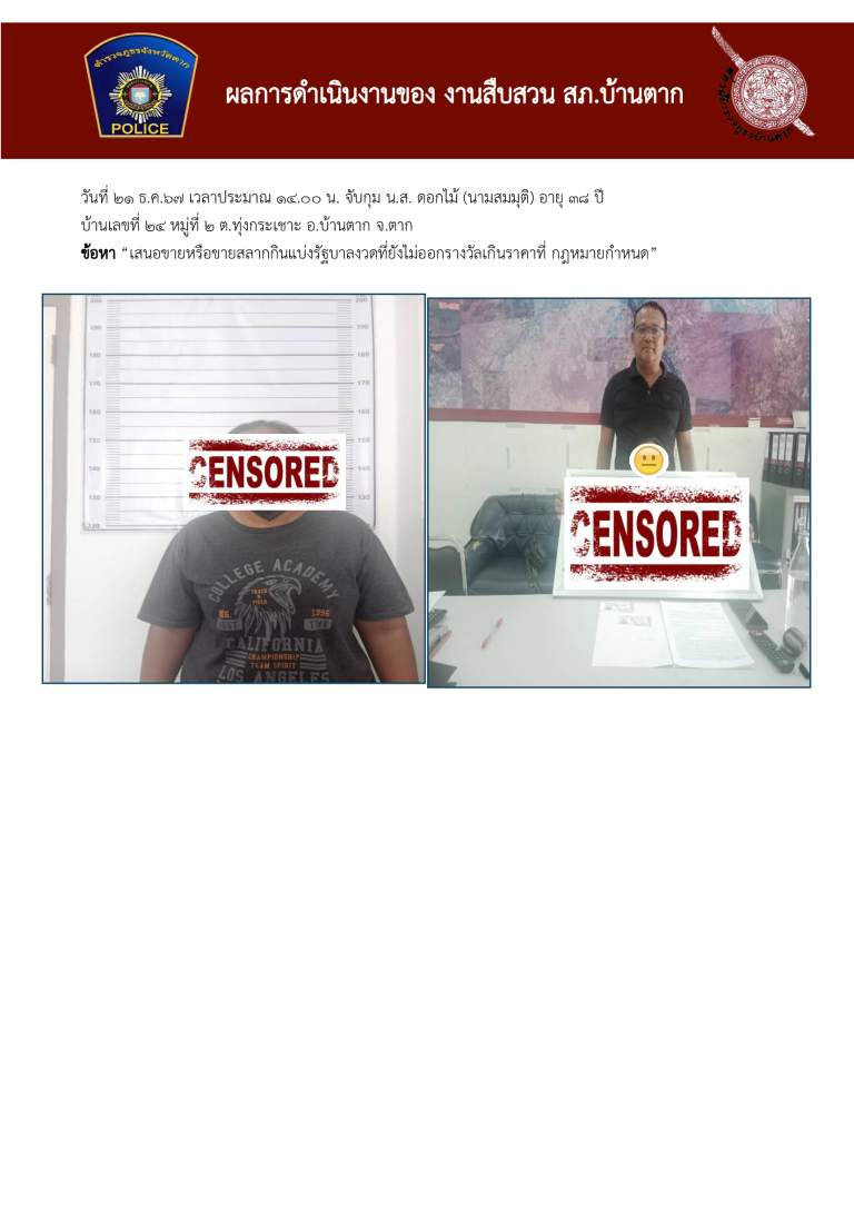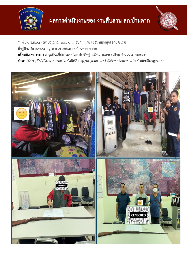 วันที่ 30 ธ.ค.67 เวลาประมาณ 10.30 น. จับกุม นาย เอ (นามสมมุติ) อายุ 29 ปีที่อยู่ปัจจุบัน 102/1 หมู่ 8 ต.เกาะตะเภา อ.บ้านตาก จ.ตากพร้อมด้วยของกลาง อาวุธปืนแก็ปยาวแบบไทยประดิษฐ์ ไม่มีหมายเลขทะเบียน จำนวน 1 กระบอกข้อหา “มีอาวุธปืนไว้ในครอบครอง โดยไม่ได้รับอนุญาต ,เสพยาเสพติดให้โทษประเภท 1 (ยาบ้า)โดยผิดกฎหมาย”