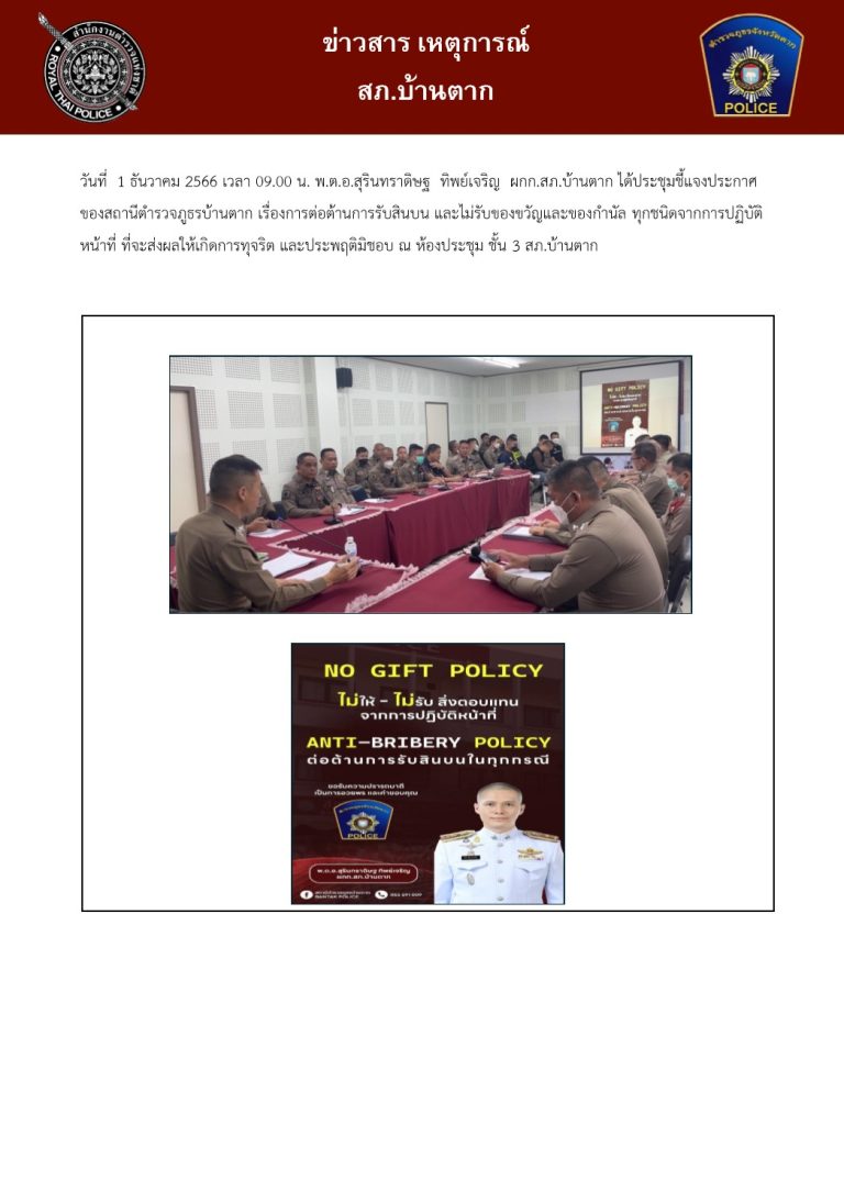 ได้ประชุมชี้แจงประกาศของสถานีตำรวจภูธรบ้านตาก เรื่องการต่อต้านการรับสินบน และไม่รับของขวัญและของกำนัล ทุกชนิดจากการปฏิบัติหน้าที่ ที่จะส่งผลให้เกิดการทุจริต และประพฤติมิชอบ