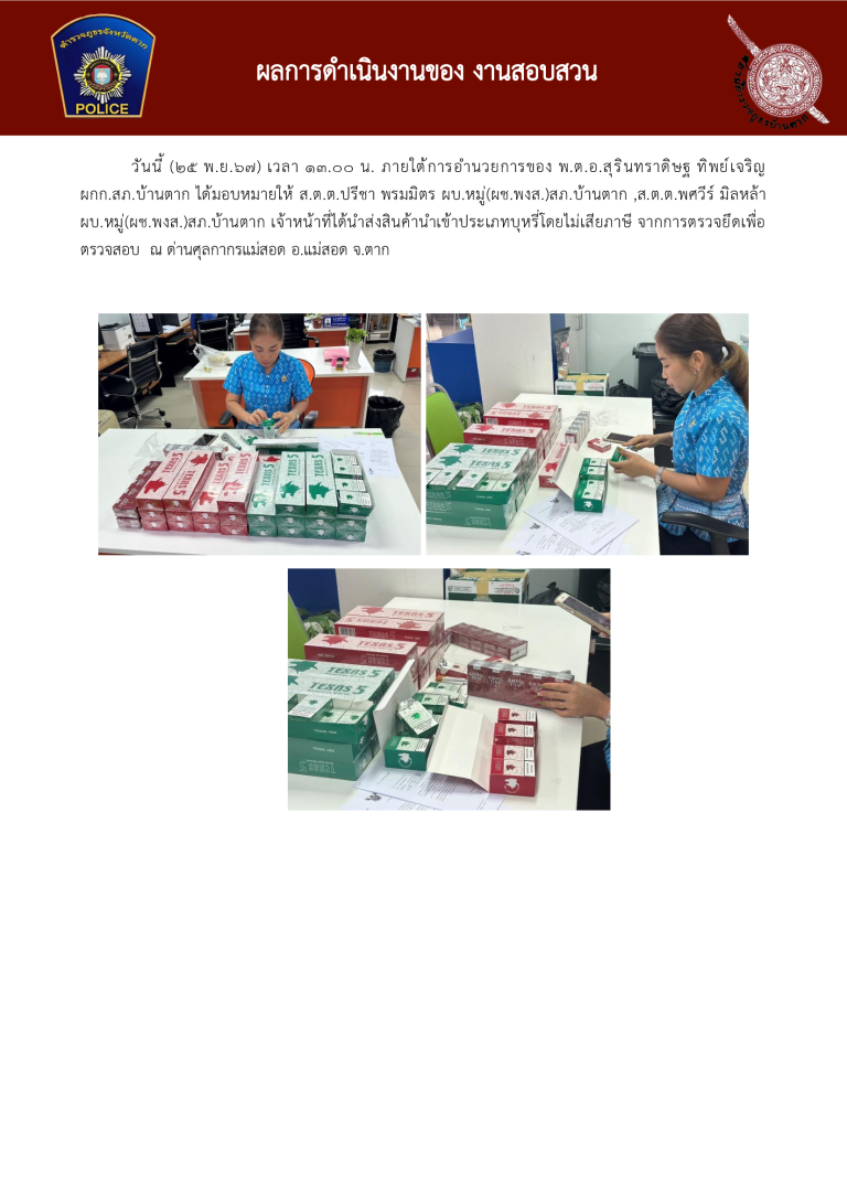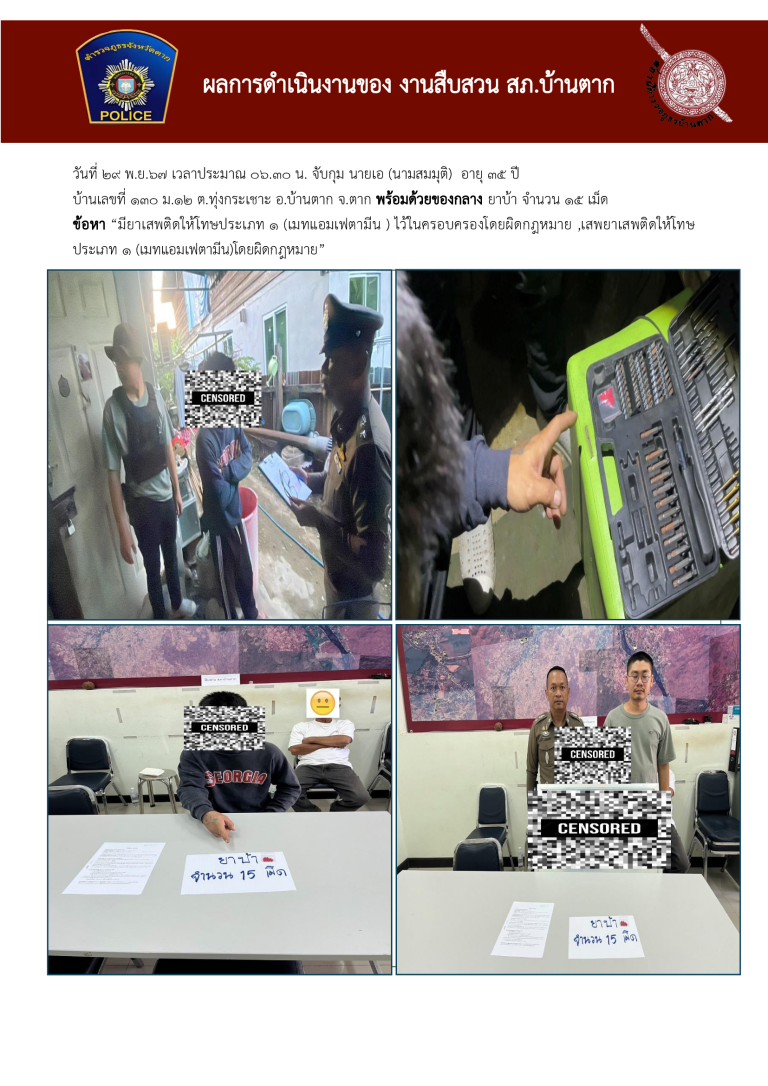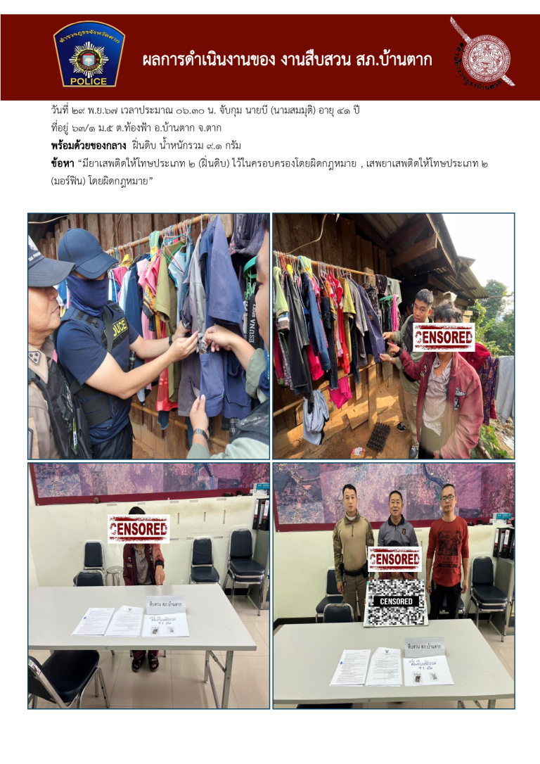 วันที่ 29 พ.ย.67 เวลาประมาณ 06.30 น. จับกุม นายบี (นามสมมุติ) อายุ 41 ปีที่อยู่ 63/1 ม.5 ต.ท้องฟ้า อ.บ้านตาก จ.ตากพร้อมด้วยของกลาง ฝิ่นดิบ น้ำหนักรวม 9.1 กรัมข้อหา “มียาเสพติดให้โทษประเภท 2 (ฝิ ่นดิบ) ไว้ในครอบครองโดยผิดกฎหมาย , เสพยาเสพติดให้โทษประเภท 2(มอร์ฟิน) โดยผิดกฎหมาย”