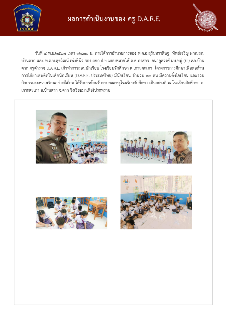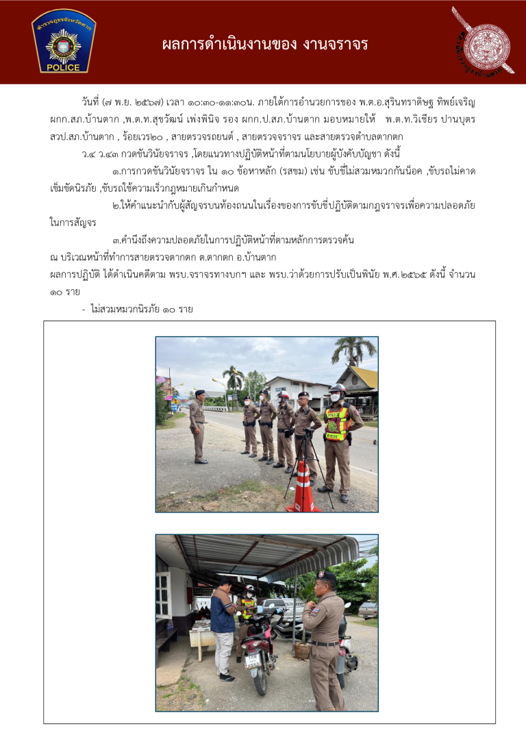 การกวดขันวินัยจราจร ใน10ข้อหาหลัก (รสขม) เช่น ขับขี่ไม่สวมหมวกกันน็อค ,ขับรถไม่คาดเข็มขัดนิรภัย ,ขับรถใช้ความเร็วกฎหมายเกินกำหนด ณ บริเวณหน้าที่ทำการสายตรวจตากออก ต.ตากออก อ.บ้านตาก