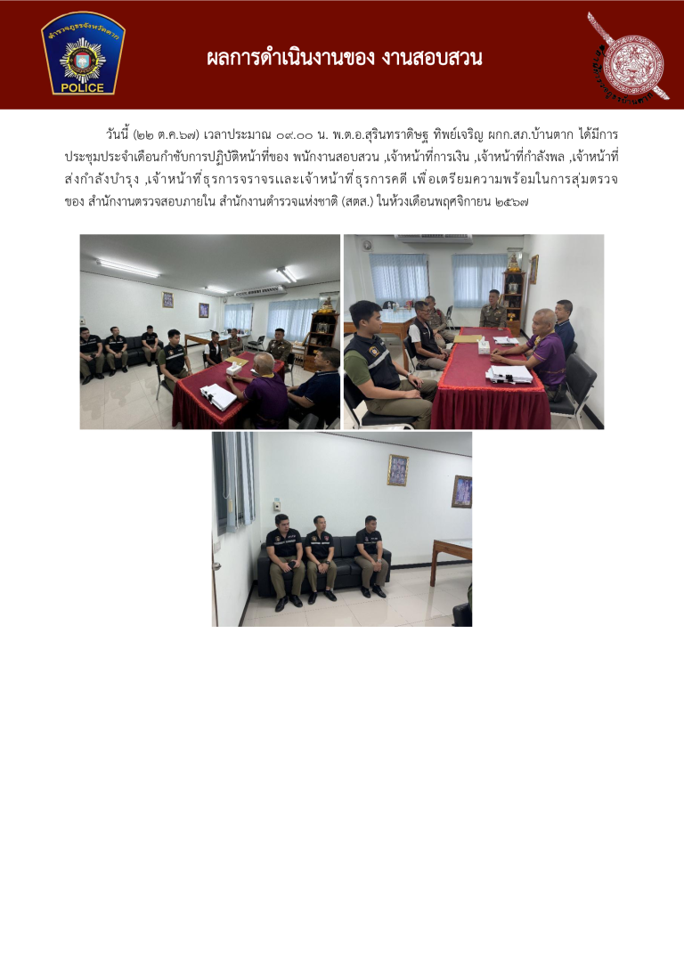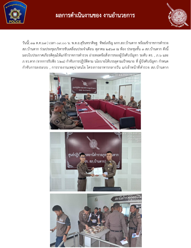 วันนี้( 31 ต.ค.67 ) เวลา 09.00 น. พ.ต.อ.สุรินทราดิษฐ ทิพย์เจริญ ผกก.สภ.บ้านตาก พร้อมข้าราชการตำรวจสภ.บ้านตาก ร่วมประชุมบริหารขับเคลื่อนประจำเดือน ตุลาคม 2567 ณ ห้อง ประชุมชั ้น 3 สภ.บ้านตาก ดังนี้มอบใบประกาศเกียรติคุณให้แก่ข้าราชการตำรวจ ถ่ายทอดข้อสั ่งการของผู ้บังคับบัญชา ระดับ ตร. , ภ.6 และภ.จว.ตาก (จากการรับฟัง ว.28) กำชับการปฏิบัติตาม นโยบายให้บรรลุตามเป้าหมาย ที่ ผู ้บังคับบัญชา กำหนดกำชับการลงระบบ , การรายงานเหตุน่าสนใจ โครงการอาหารกลางวัน แก่เจ้าหน้าที ่ตำรวจ สภ.บ้านตาก