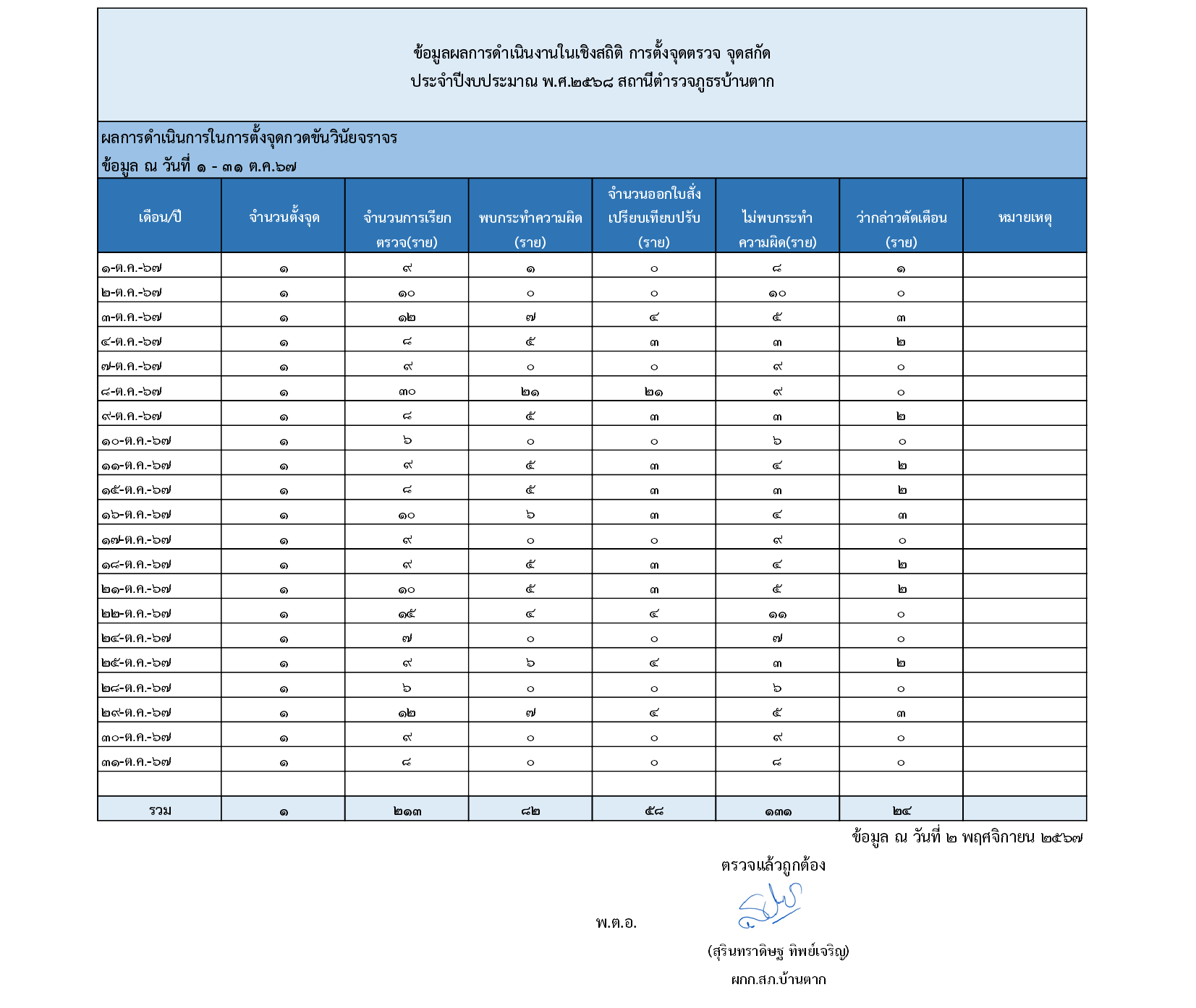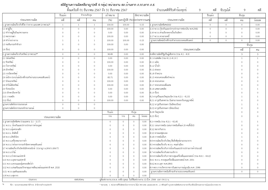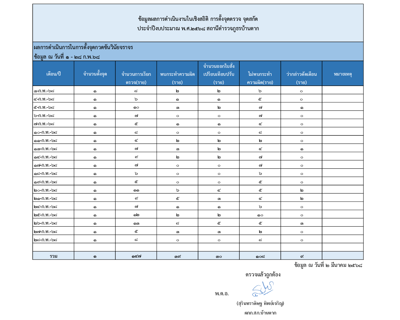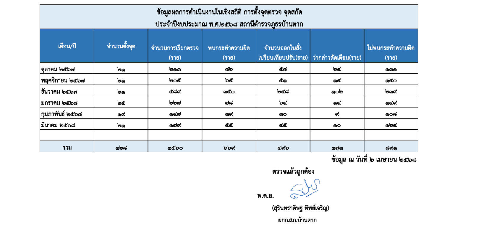 สถิติการตั้งจุดตรวจ จุดสกัดรอบ 6 เดือนแรก ต.ค.67-มี.ค.68