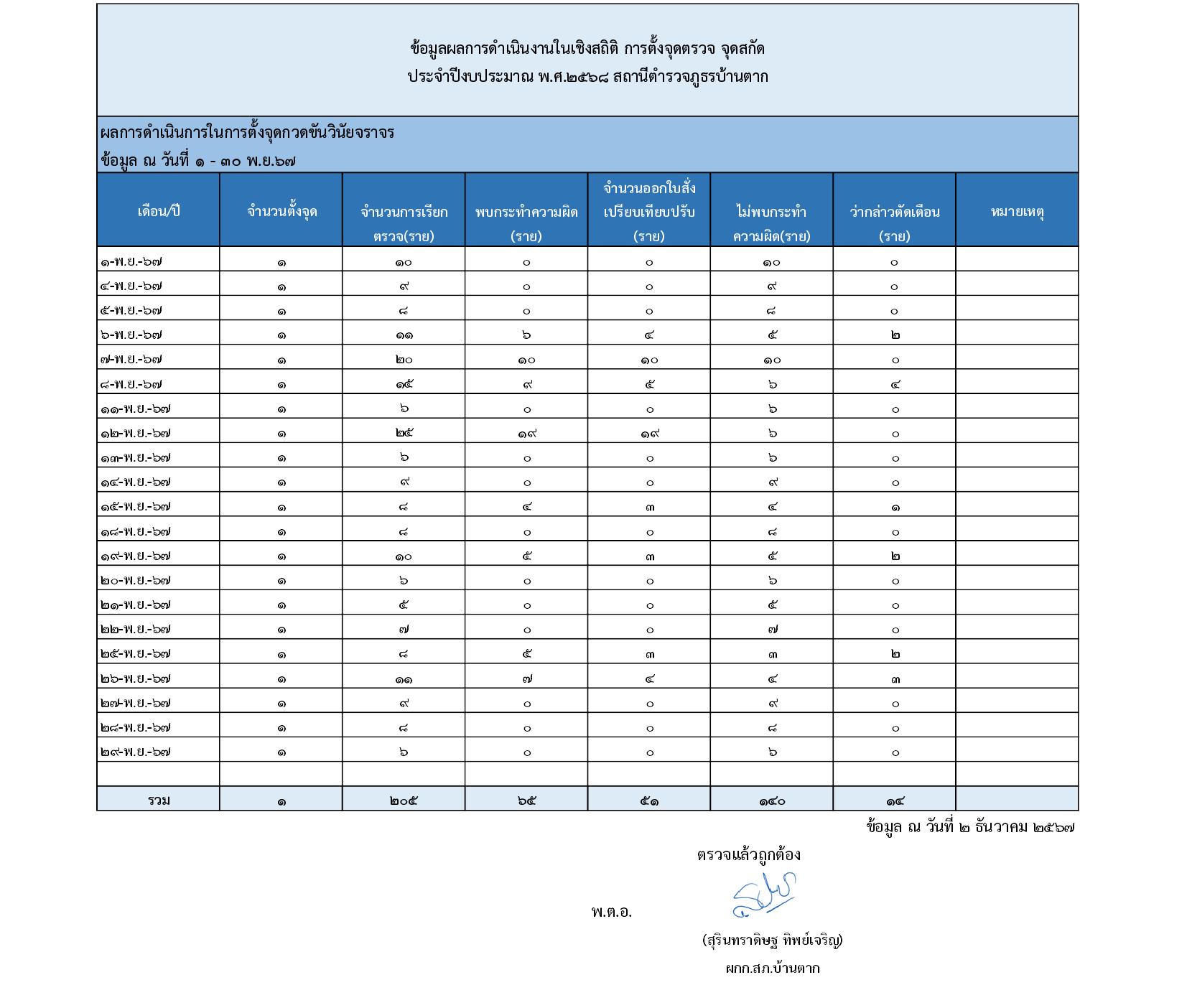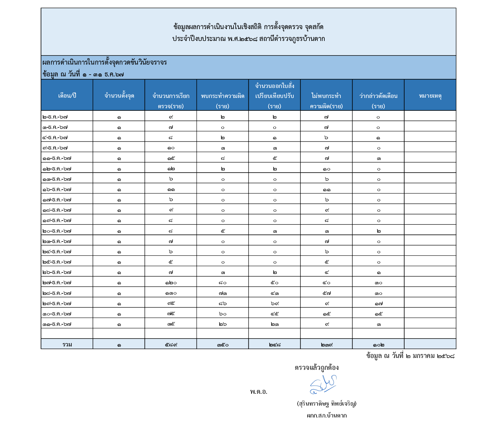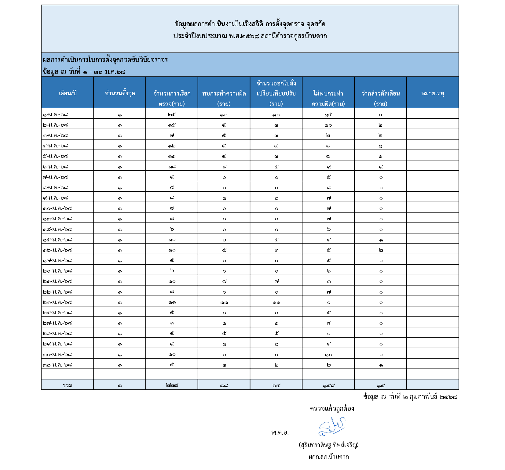 ข้อมูลผลการดำเนินงานเชิงสถิติในการตั้งจุดตรวจ จุดสกัด ประจำเดือน