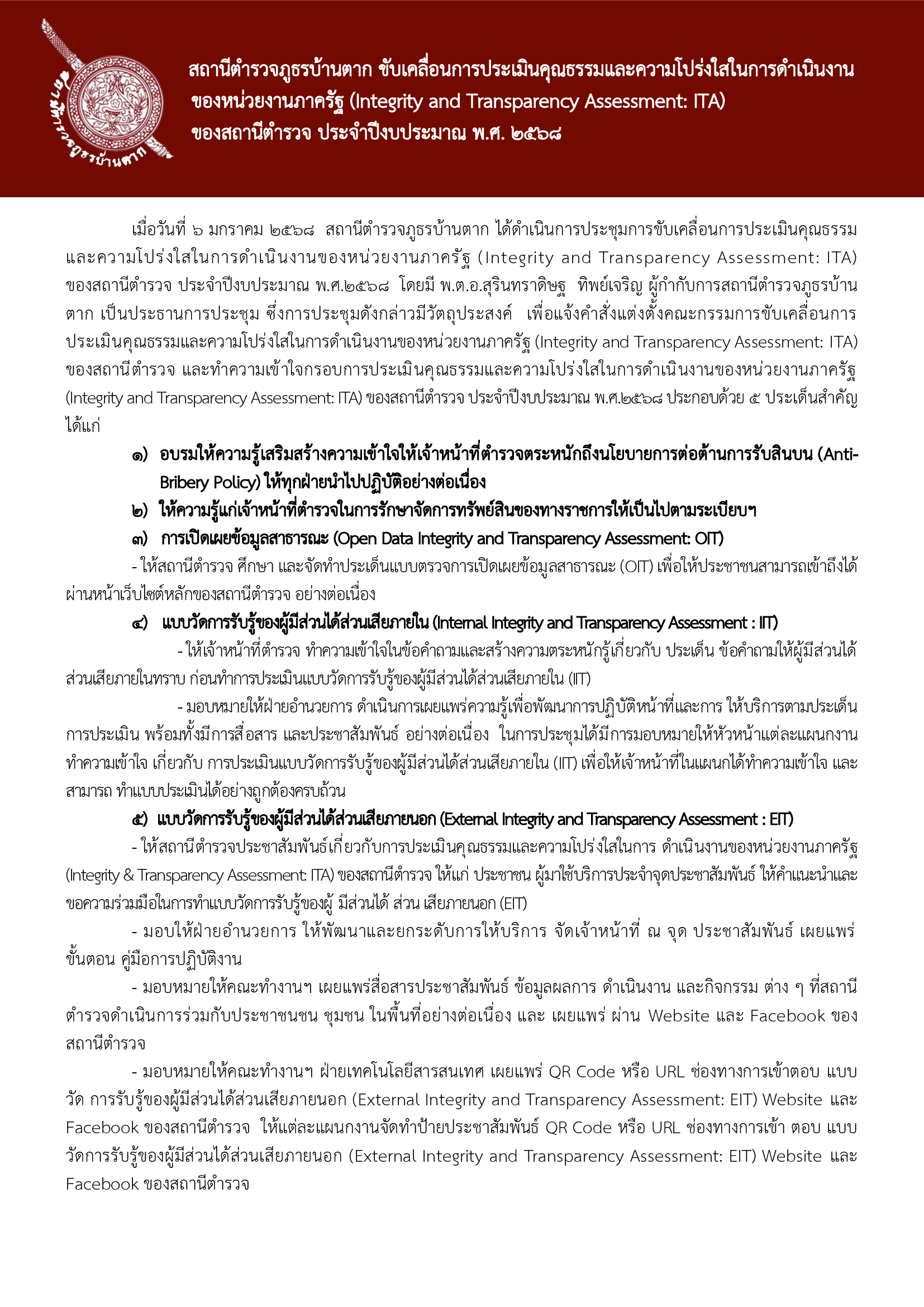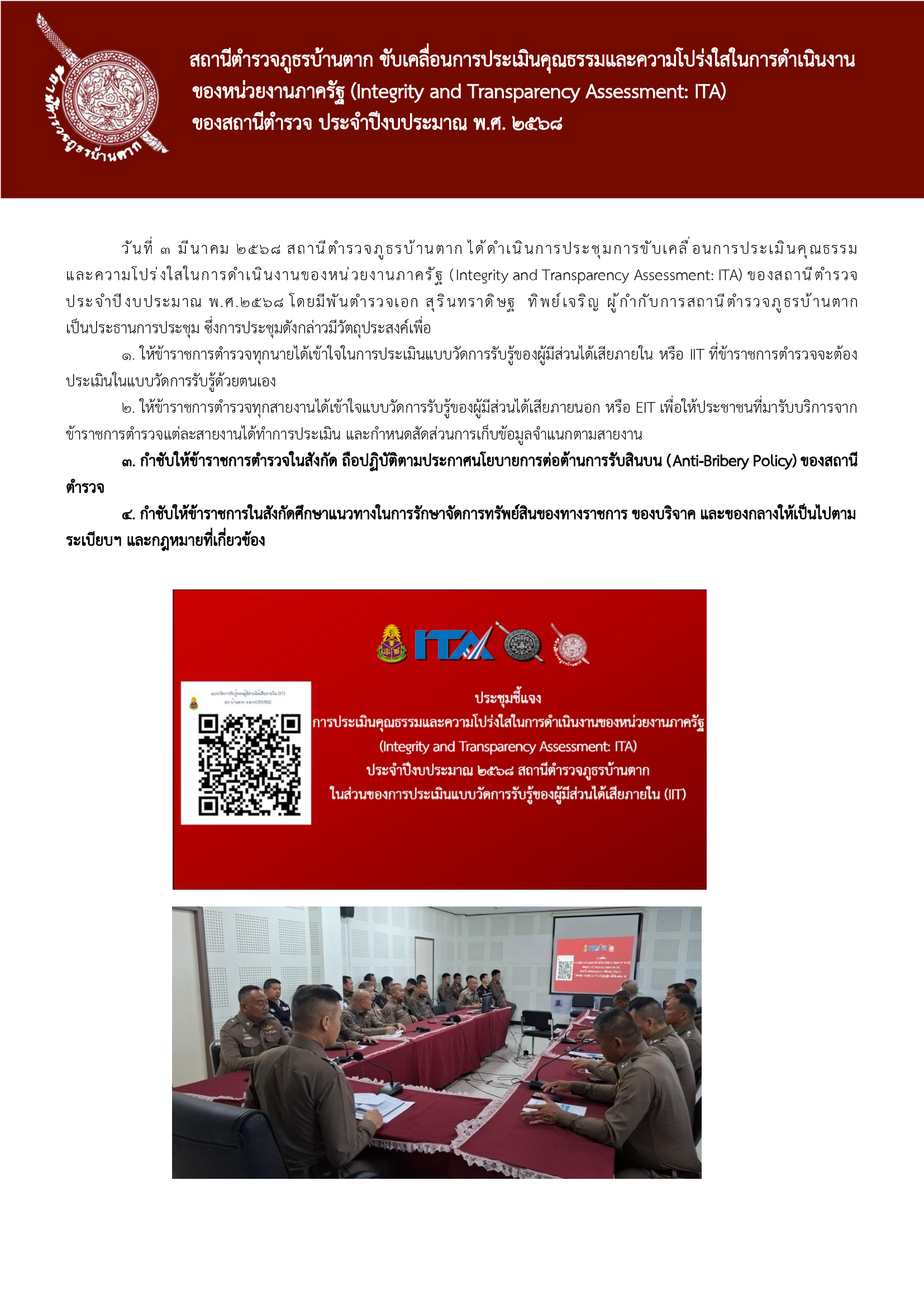 การประชาสัมพันธ์ข้อมูลการประเมินคุณธรรมและความโปร่งใส ในการดำเนินงานของหน่วยงานภาครัฐ (Integrity & Transparency Assessment : ITA) ของสถานีตำรวจภูธรบ้านตาก ประจำปีงบประมาณ พ.ศ.2568