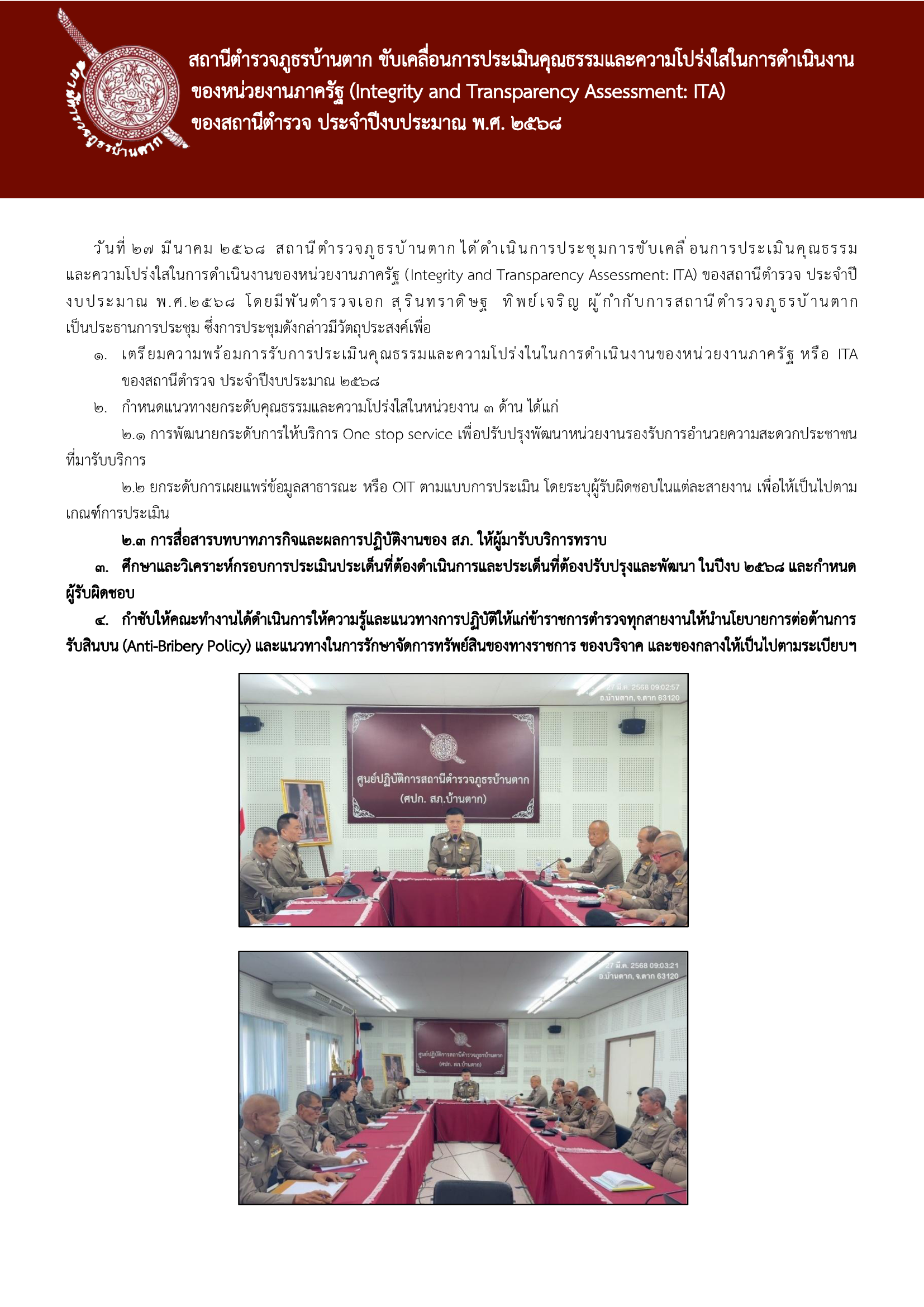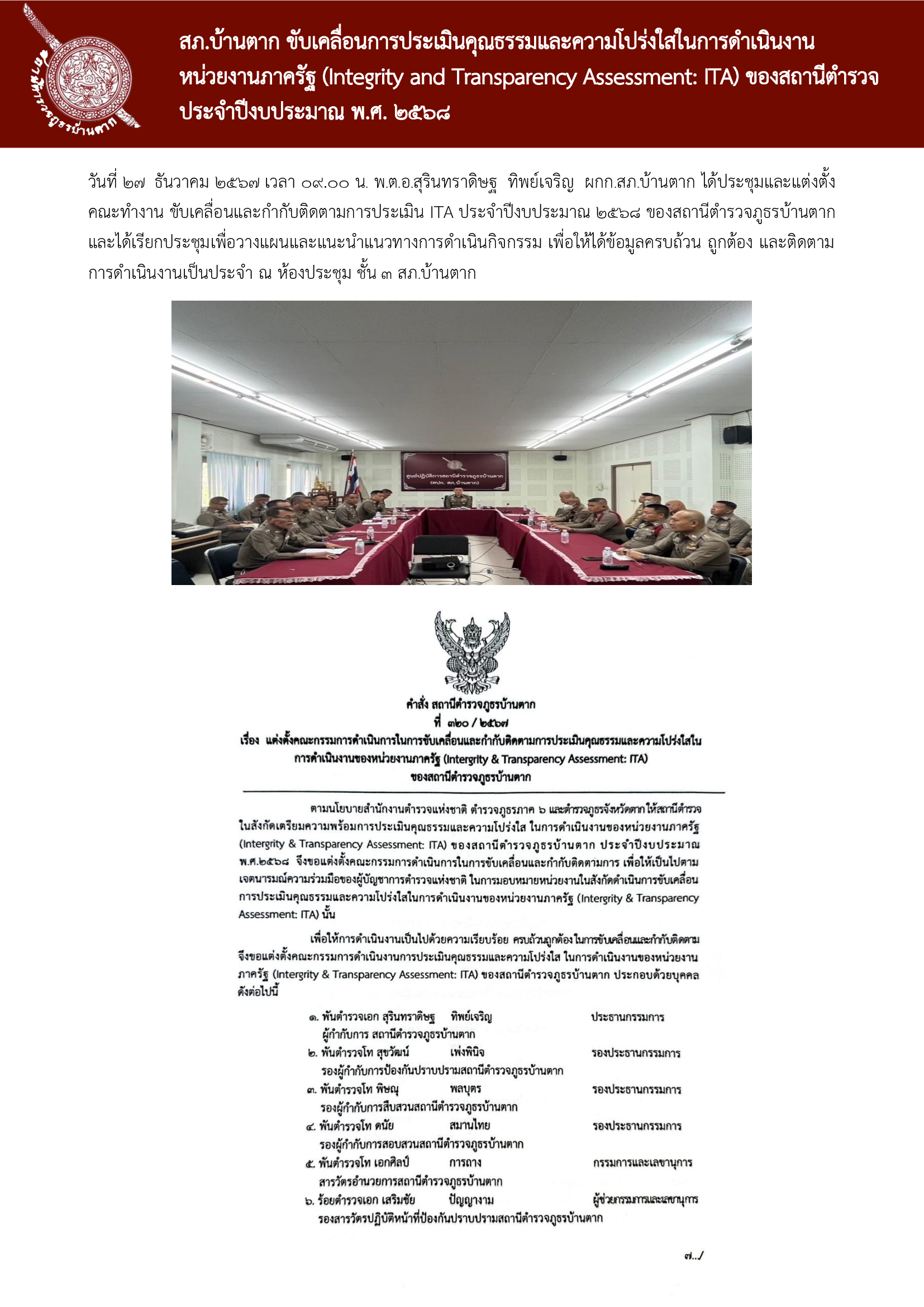 เมื่อวันที่ 6 มกราคม 2568 สถานีตำรวจภูธรบ้านตาก ได้ดำเนินการประชุมการขับเคลื่อนการประเมินคุณธรรมและความโปร่งใสในการดำเนินงานของหน่วยงานภาครัฐ (Integrity and Transparency Assessment: ITA)ของสถานีตำรวจ ประจำปีงบประมาณ พ.ศ.2568 โดยมี พ.ต.อ.สุรินทราดิษฐ ทิพย์เจริญ ผู้กำกับการสถานีตำรวจภูธรบ้านตาก เป็นประธานการประชุม ซึ่งการประชุมดังกล่าวมีวัตถุประสงค์ เพื่อแจ้งคำสั่งแต่งตั้งคณะกรรมการขับเคลื่อนการประเมินคุณธรรมและความโปร่งใสในการดำเนินงานของหน่วยงานภาครัฐ (Integrity and Transparency Assessment: ITA)ของสถานีตำรวจ และทำความเข้าใจกรอบการประเมินคุณธรรมและความโปร่งใสในการดำเนินงานของหน่วยงานภาครัฐ(Integrity and Transparency Assessment: ITA) ของสถานีตำรวจ ประจำปีงบประมาณ พ.ศ.2568